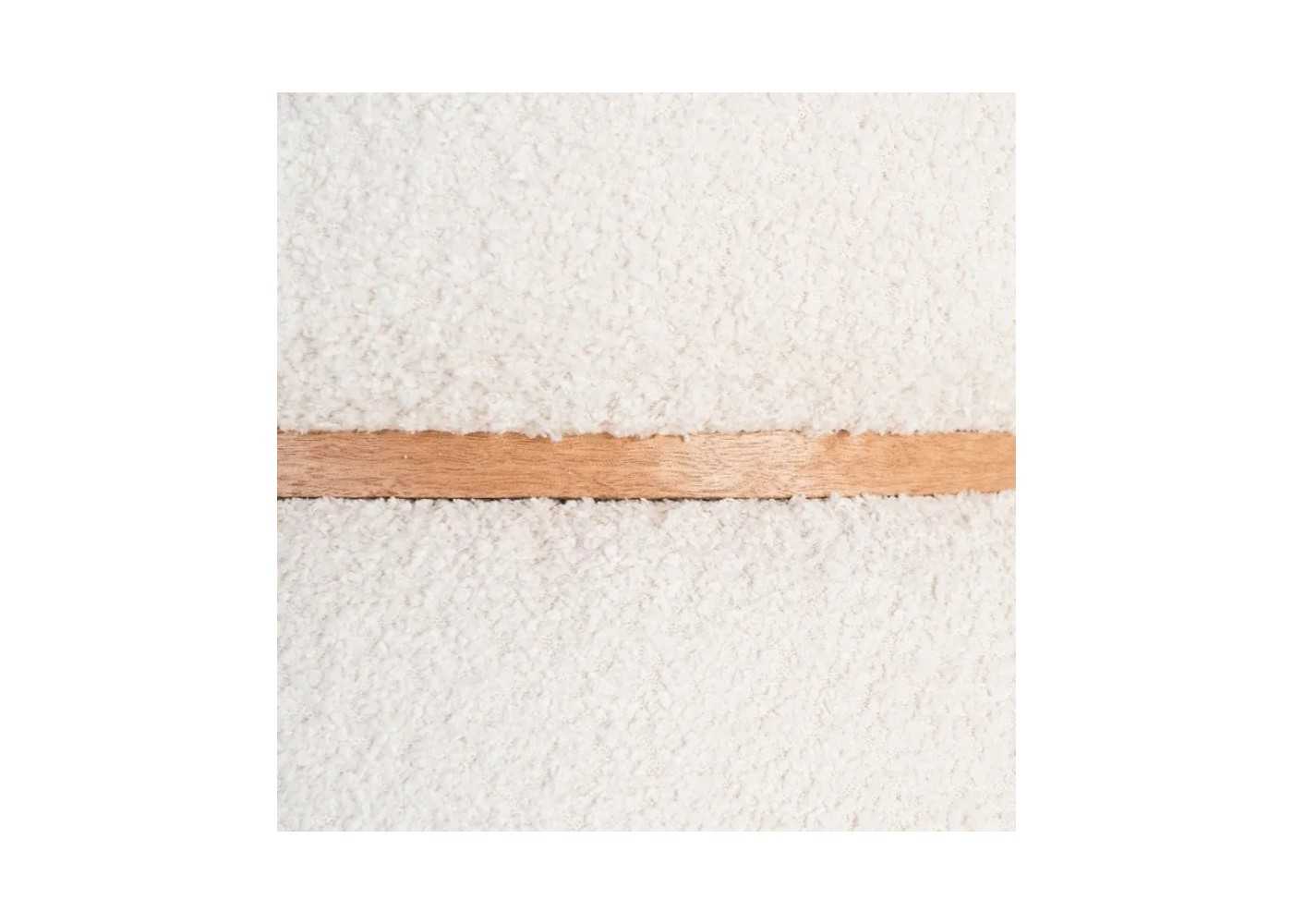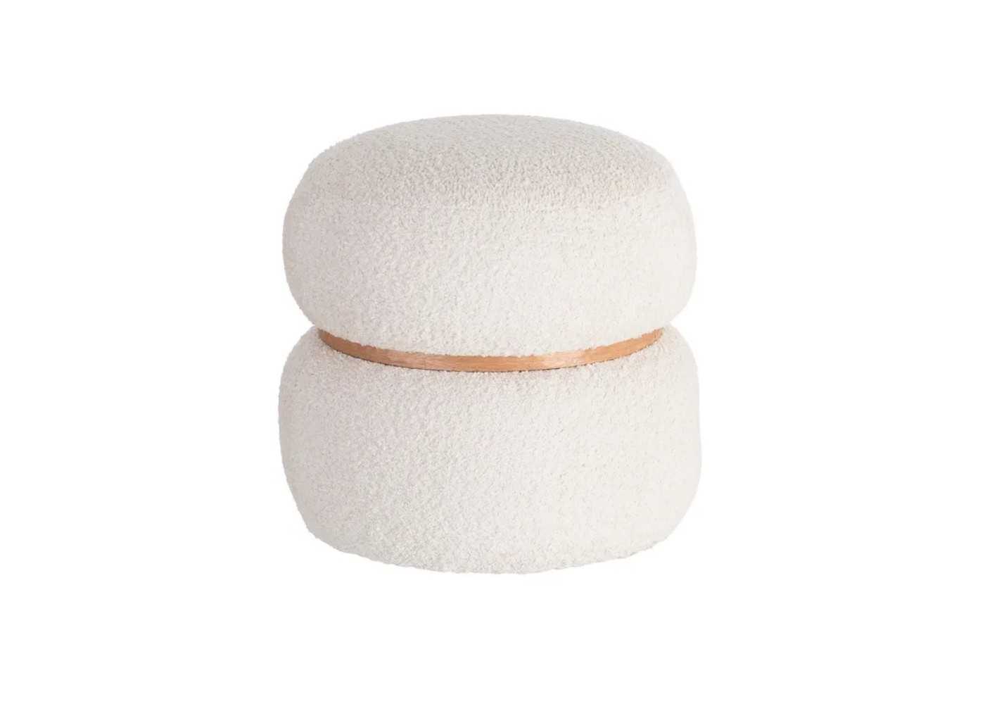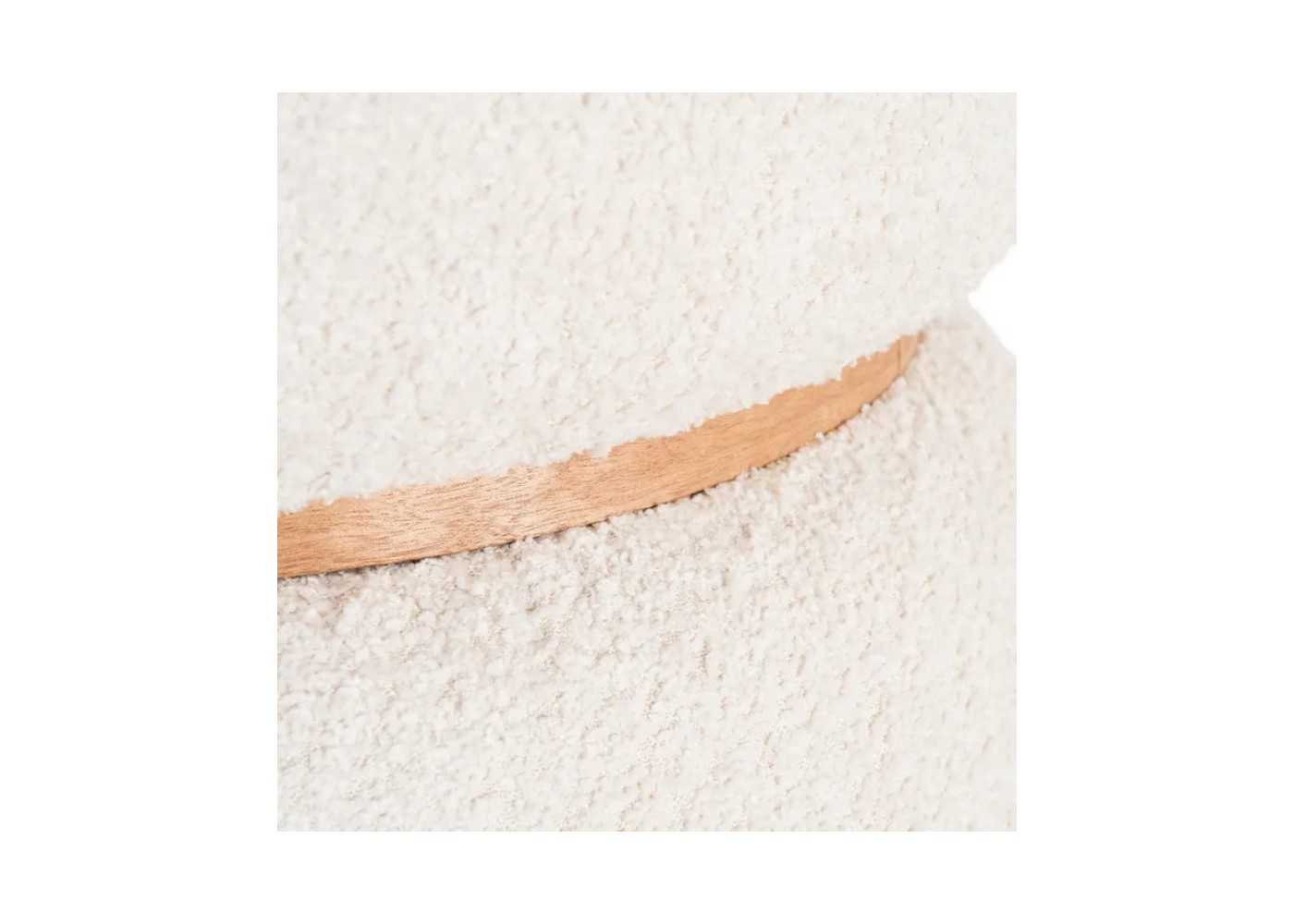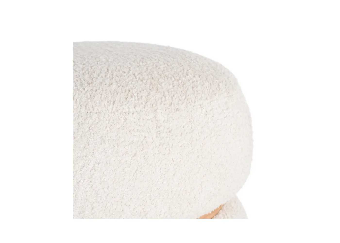 Pouf de diseño moderno y redondo fabricado en madera de pino con tapizado de tela rizada 100 % poliéster en color crema.