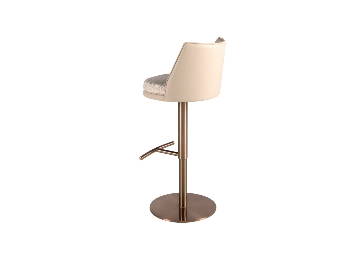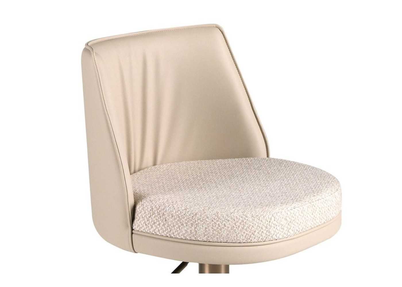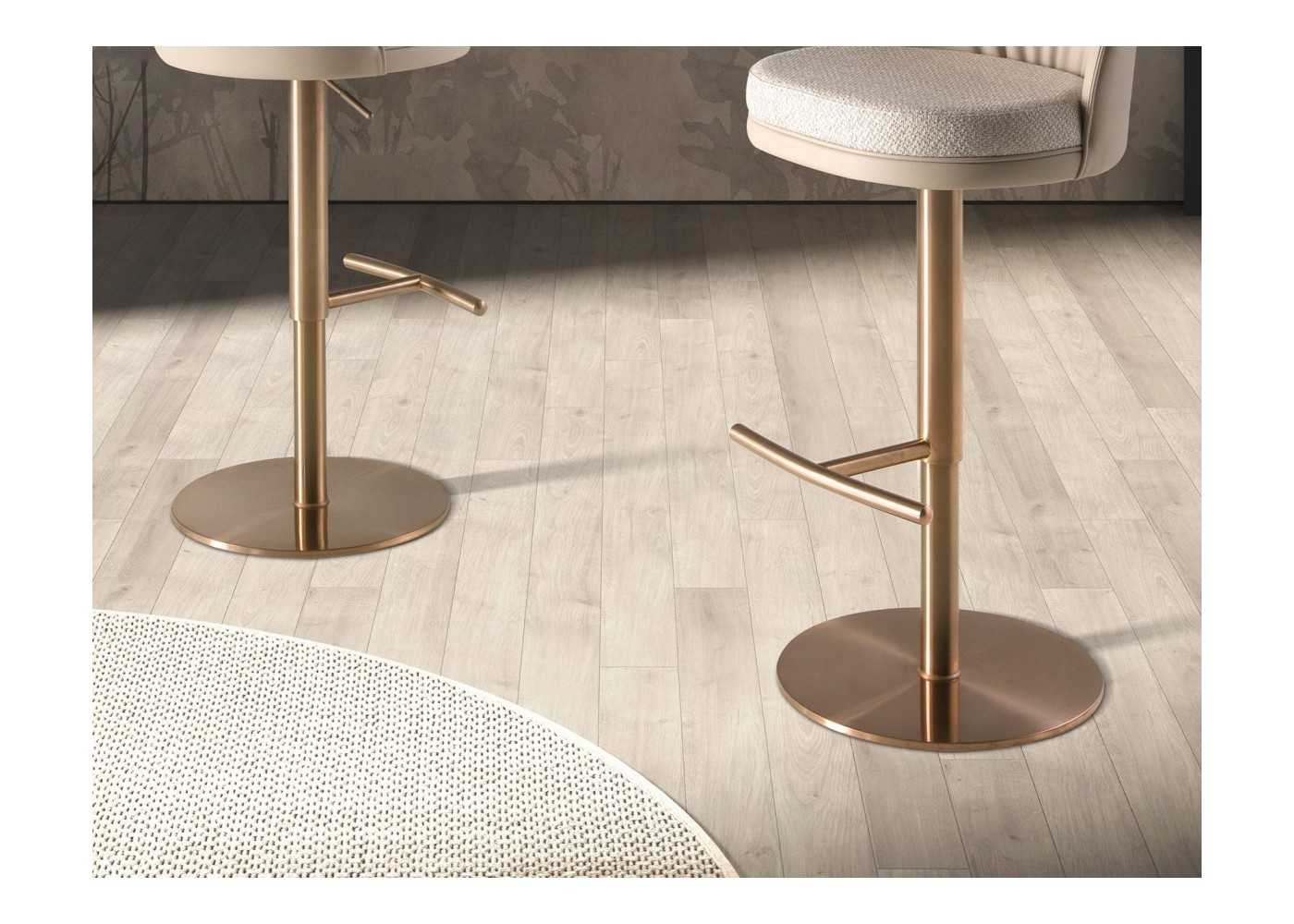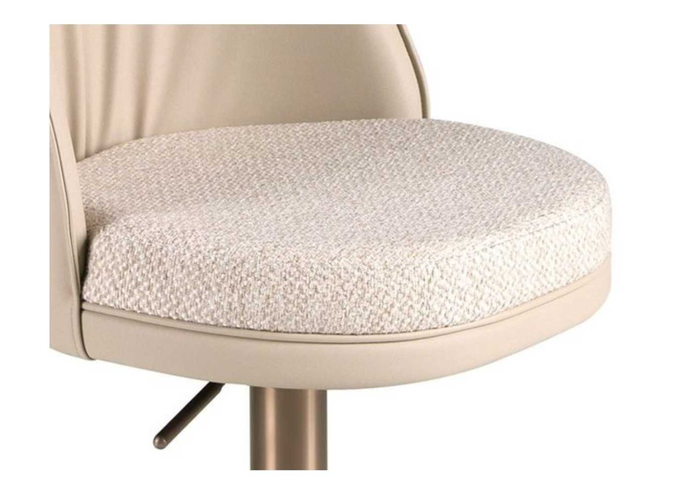 Elegante taburete giratorio de diseño moderno con asiento regulable en altura. Tapizado en piel sintética y asiento en tela. Base de acero inoxidable en color oro rosa.