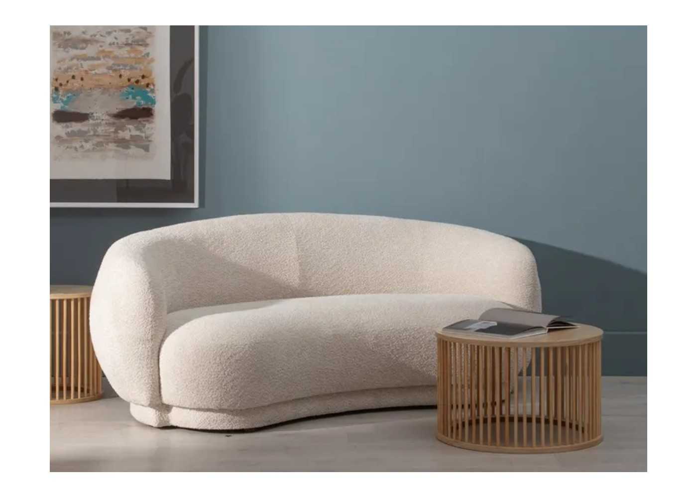 Original sofá de 2 plazas y líneas redondeadas de diseño contemporáneo tapizado en tela rizada 100% poliéster.
