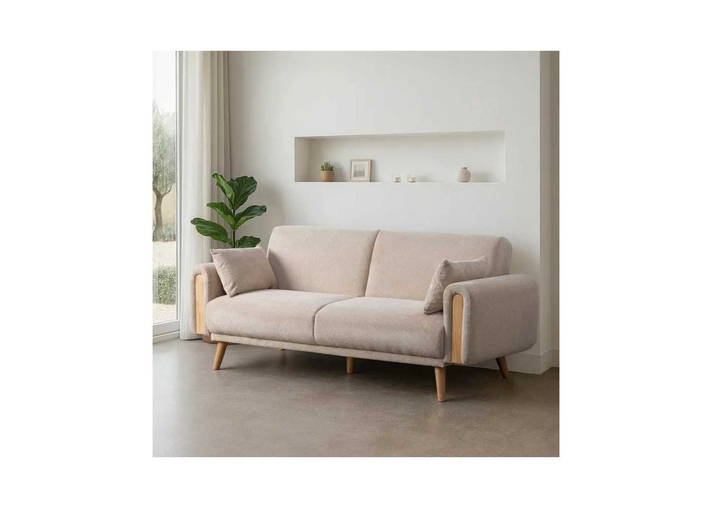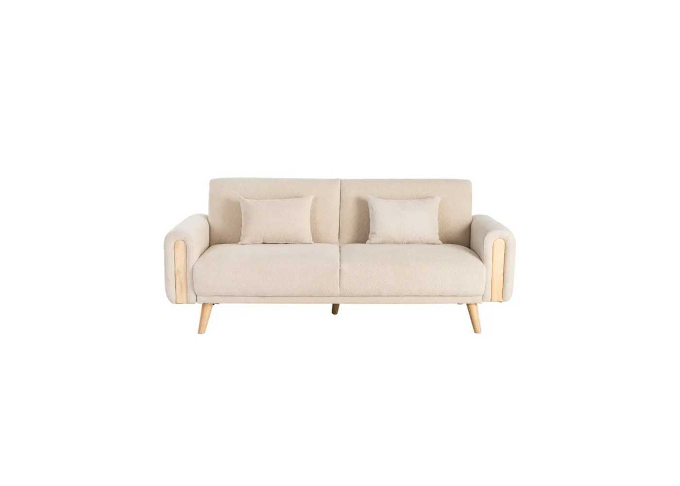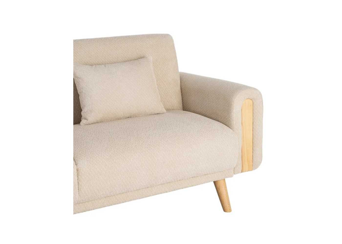 Sofá cama tapizado en tejido chenilla color crema con detalles de madera vista.