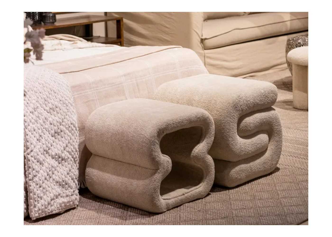 Pouf au design moderne en fer et bois avec tapissé en tissu bouclé beige.