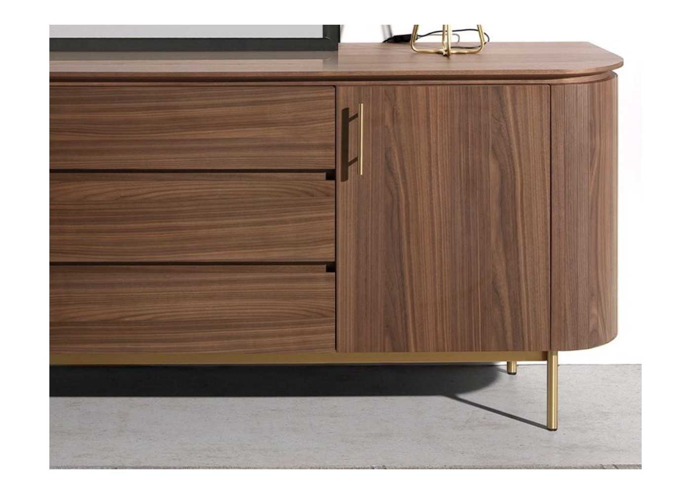 Elégant buffet design en bois plaqué noyer avec 2 portes et 3 tiroirs. Base en acier inoxydable doré poli avec pieds.