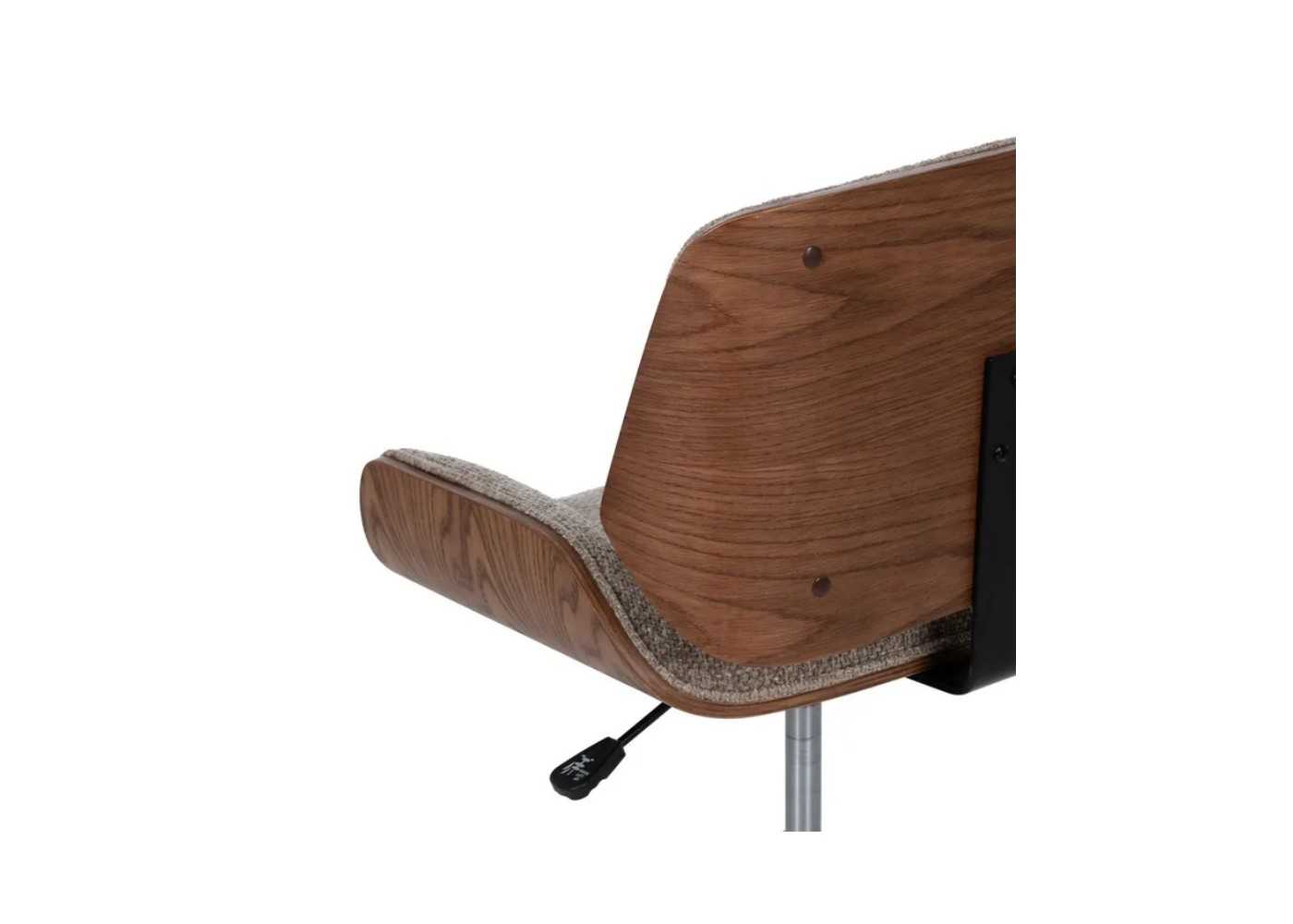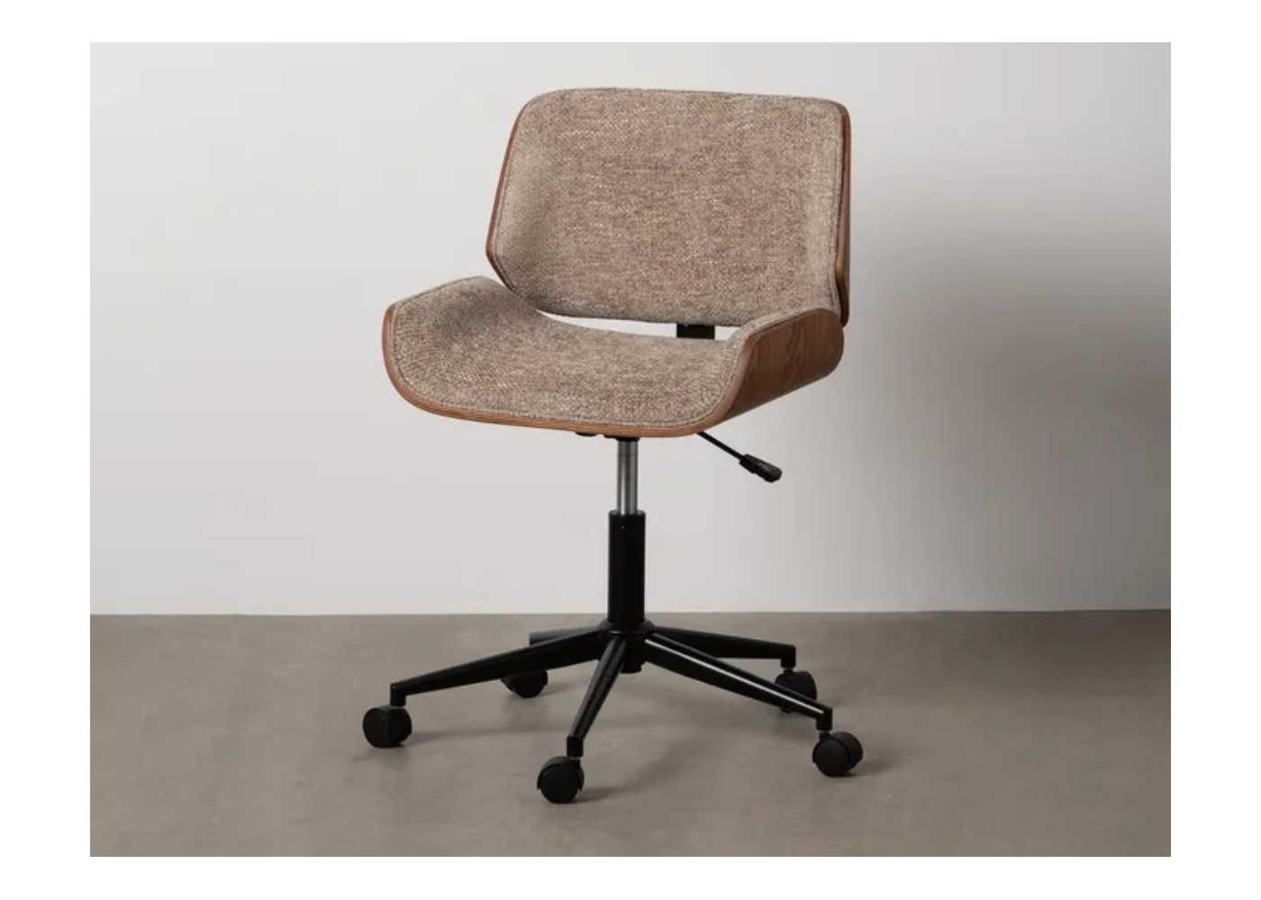 Fauteuil de bureau pivotant avec structure en composite de noyer et intérieur tapissé de tissu beige à volants, avec mécanisme de réglage en hauteur.
