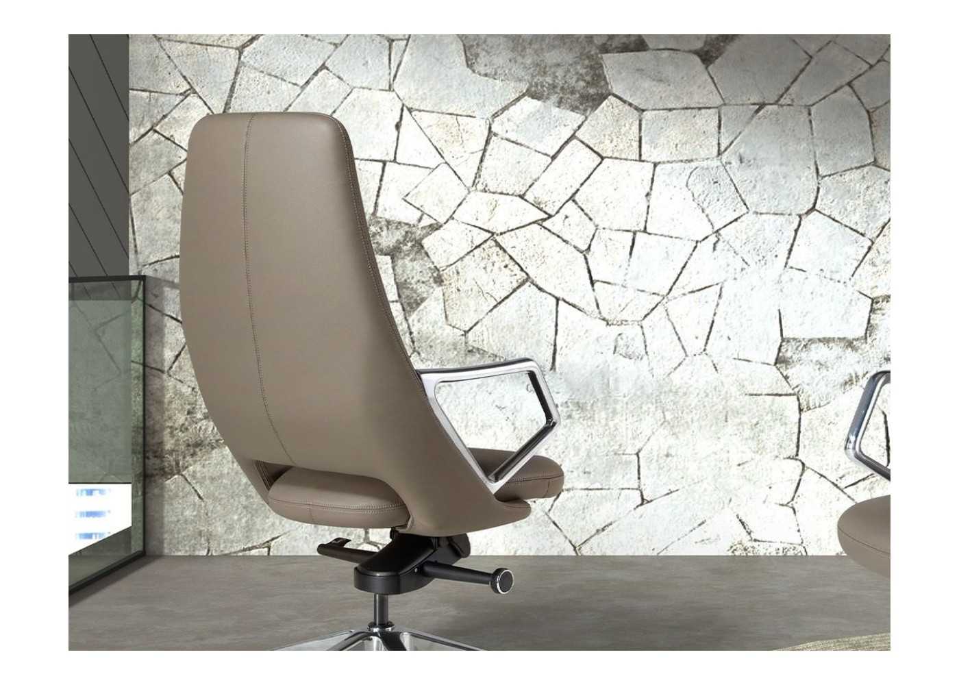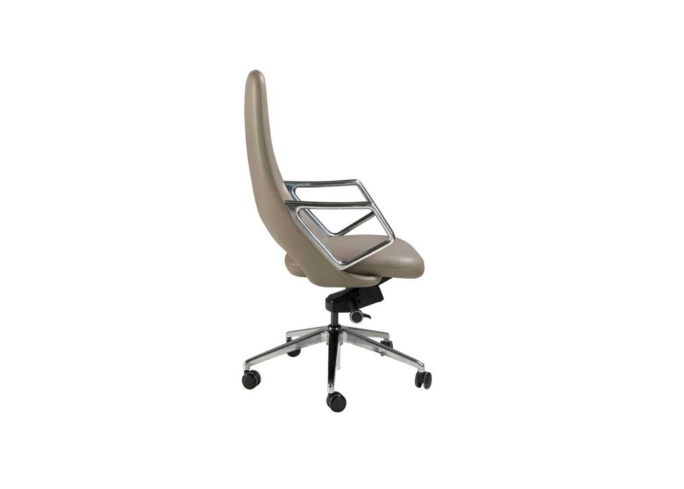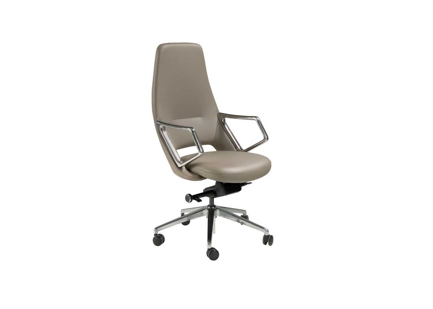 Fauteuil de bureau pivotant au design moderne et ergonomique, tapissé de cuir synthétique gris, avec accoudoirs et base pivotante en acier inoxydable poli.