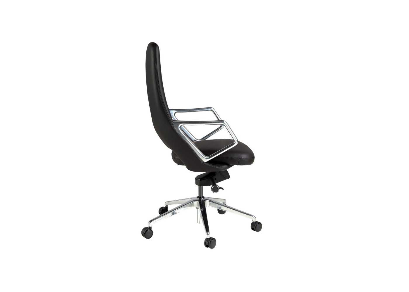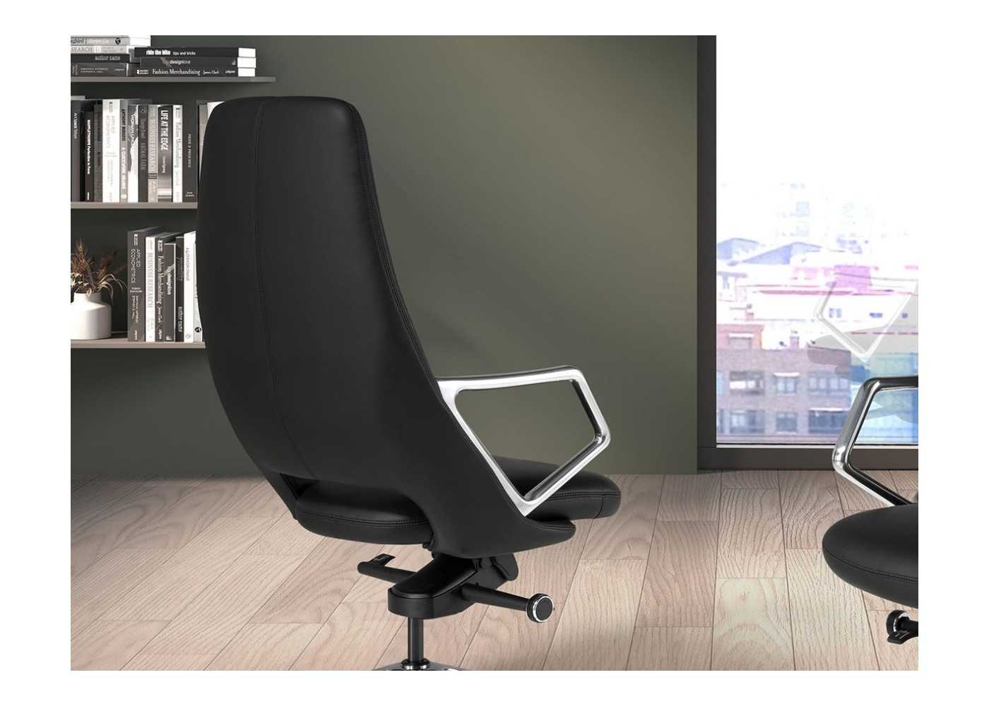 Fauteuil de bureau pivotant au design moderne et ergonomique, tapissé de cuir synthétique noir, avec accoudoirs et base pivotante en acier inoxydable poli.