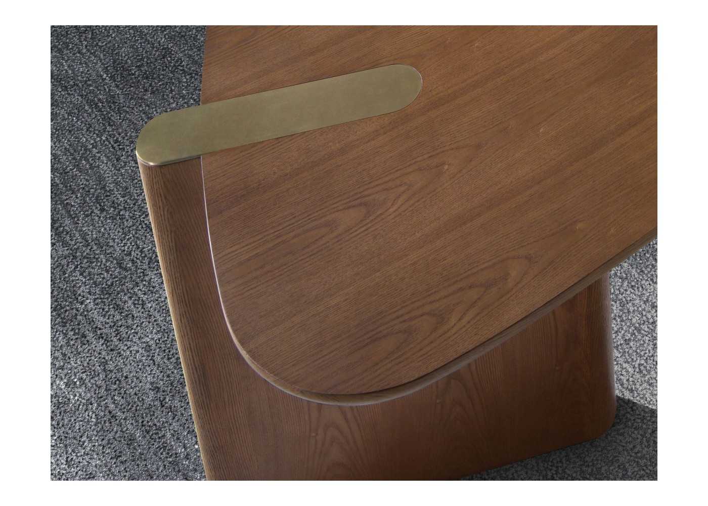 Table de bureau élégant en frêne massif plaqué noyer clair naturel avec détails en acier inoxydable poli finition dorée.