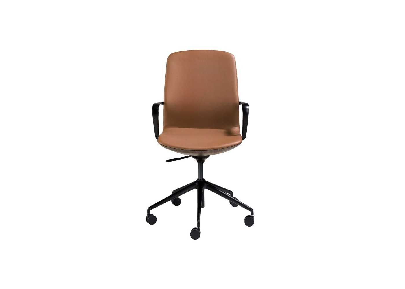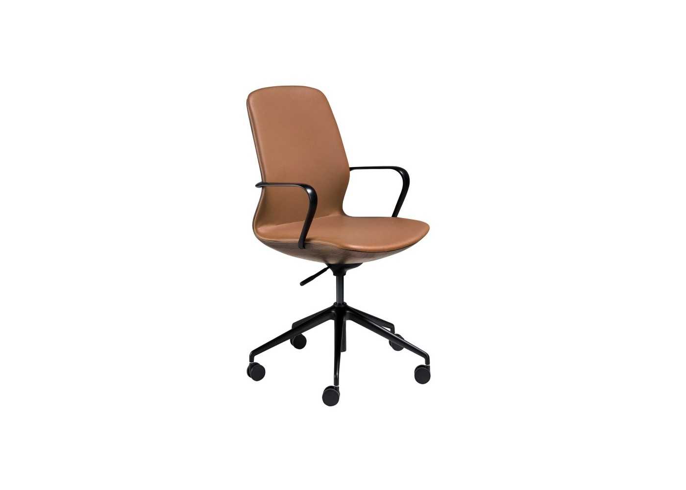 Chaise pivotant au design moderne et ergonomique, tapissé de cuir synthétique marron, avec accoudoirs et base pivotante en acier inoxydable noir.