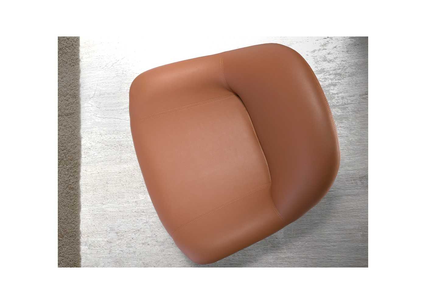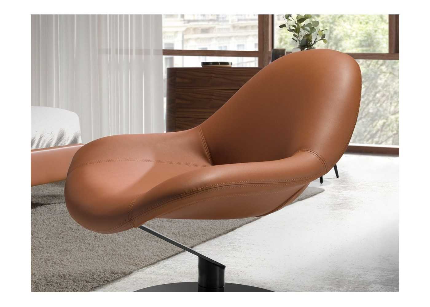 Fauteuil pivotant original tapissé de cuir synthétique marron et piètement en acier inoxydable noir mat.