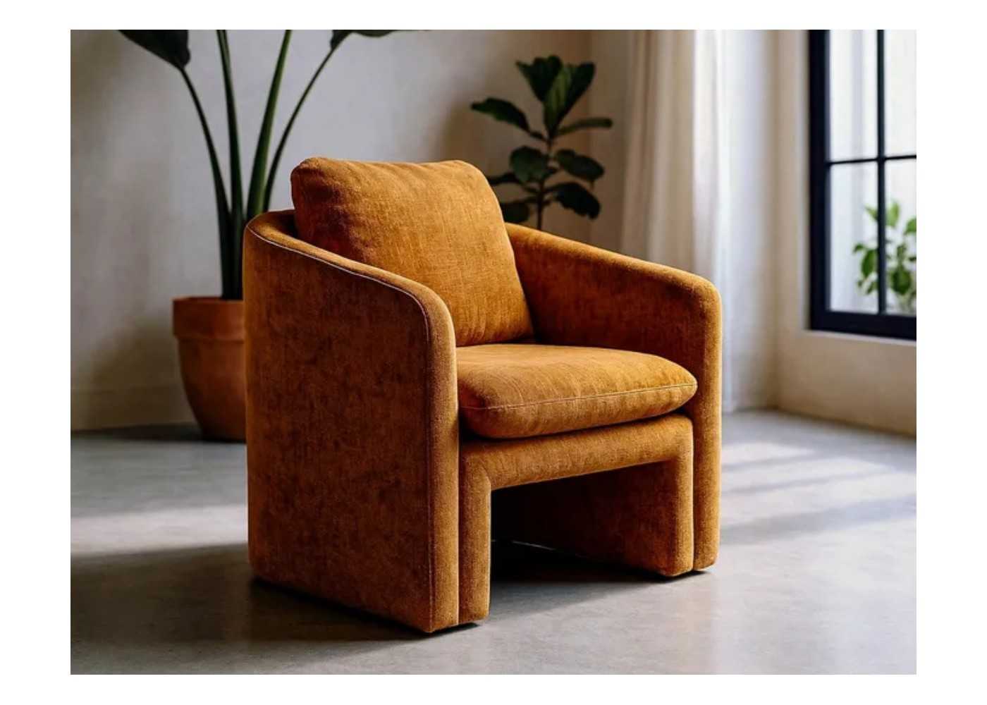 Fauteuil au design moderne aux lignes enveloppantes, tapissé d'un tissu de couleur ocre.