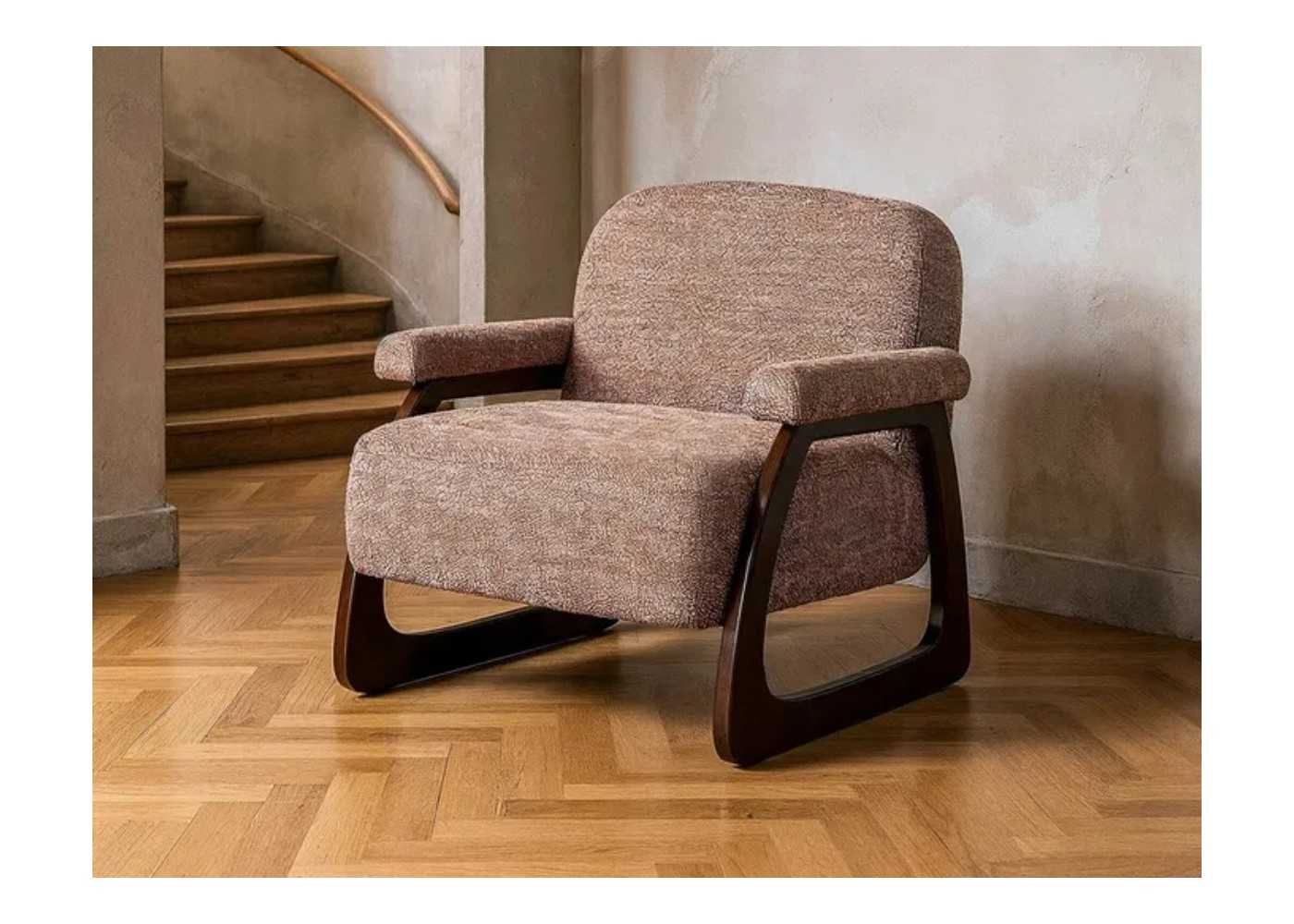 Fauteuil confortable tapissé de tissu 100 % polyester avec bois apparent.