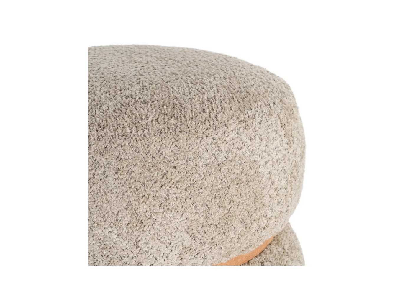 Pouf rond au design moderne, fabriqué en bois de pin et recouvert d'un tissu 100 % polyester bouclé de couleur taupe.