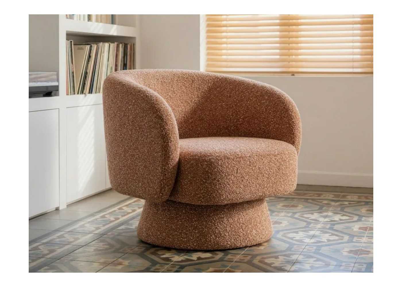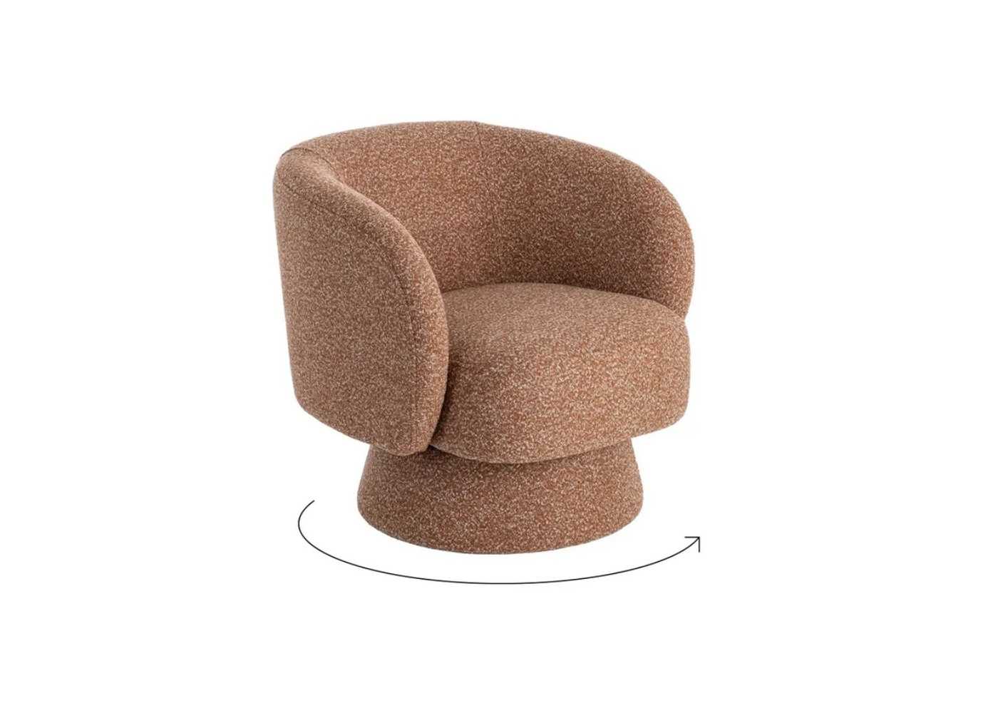 Fauteuil pivotant à 360° original au design moderne, avec accoudoirs et lignes arrondies et enveloppantes.