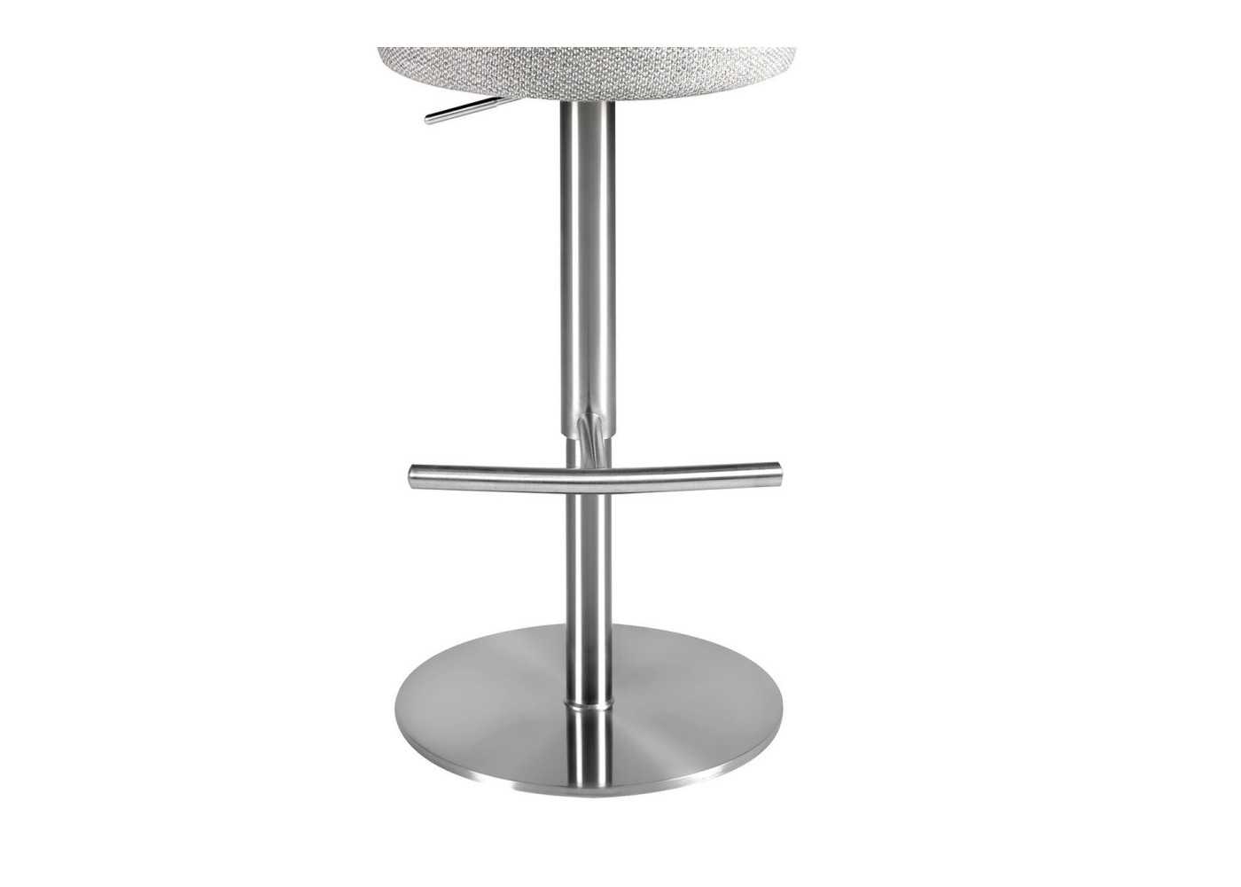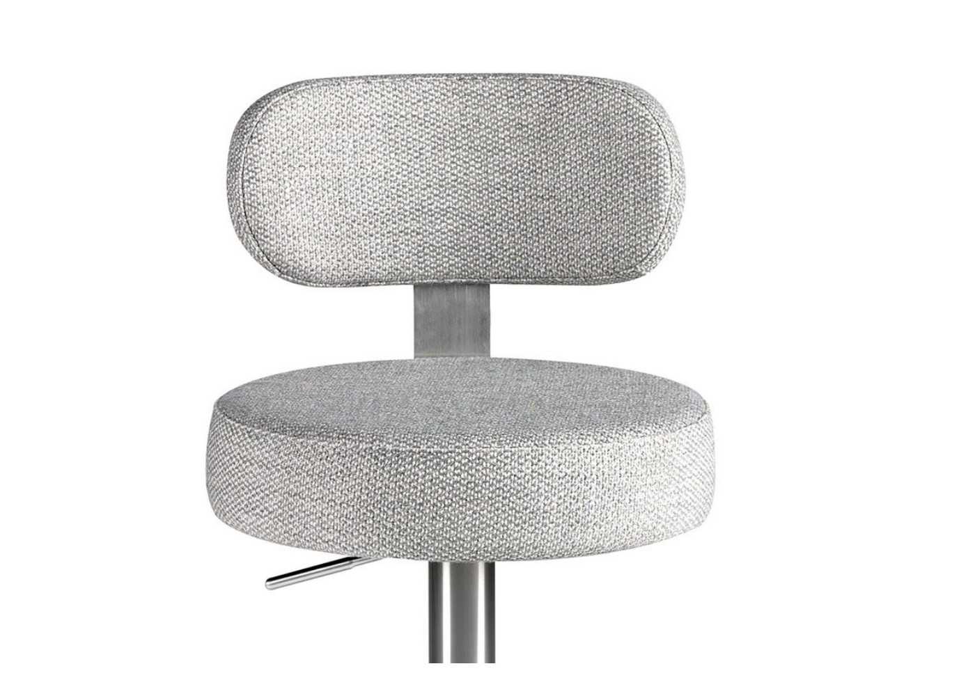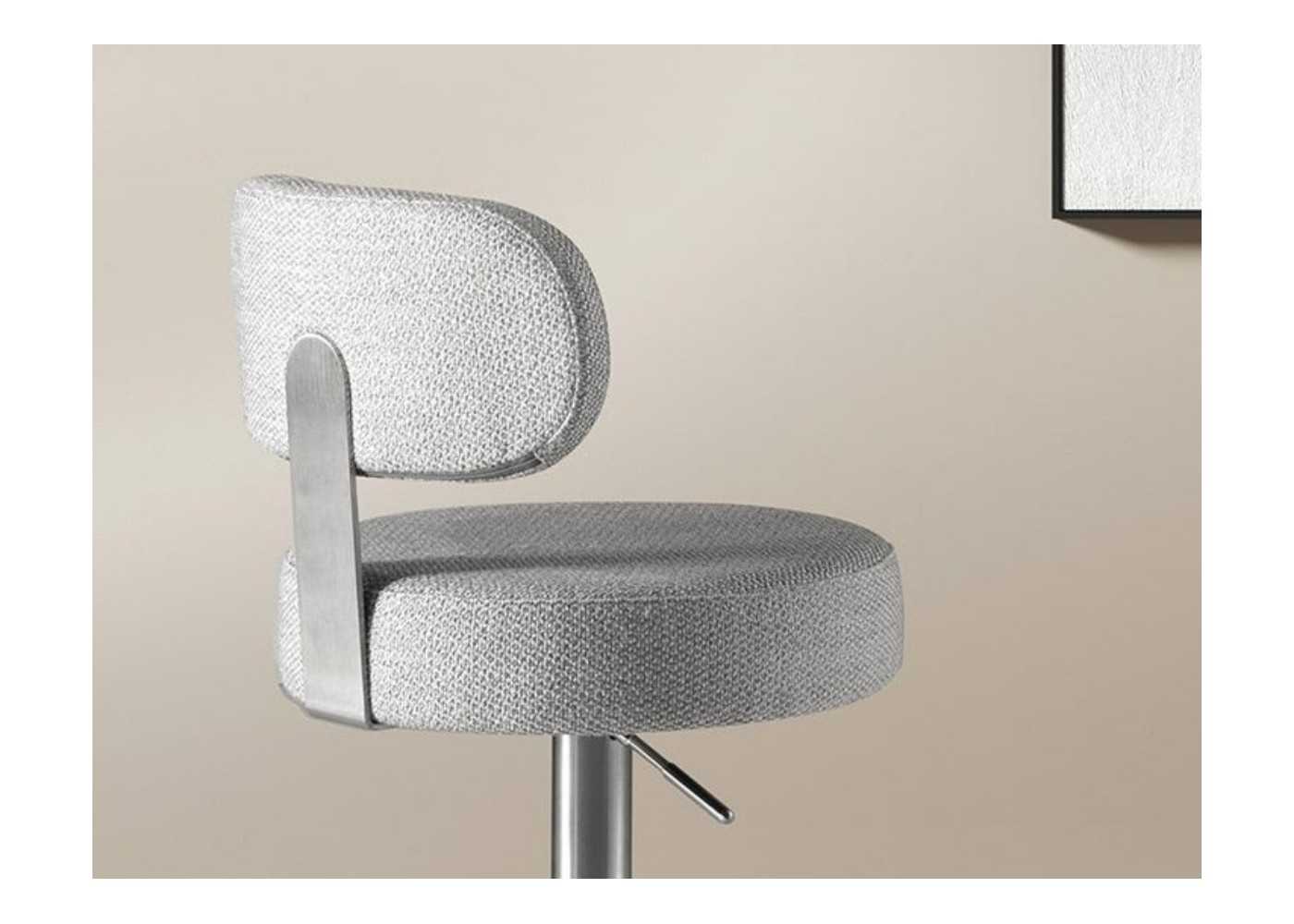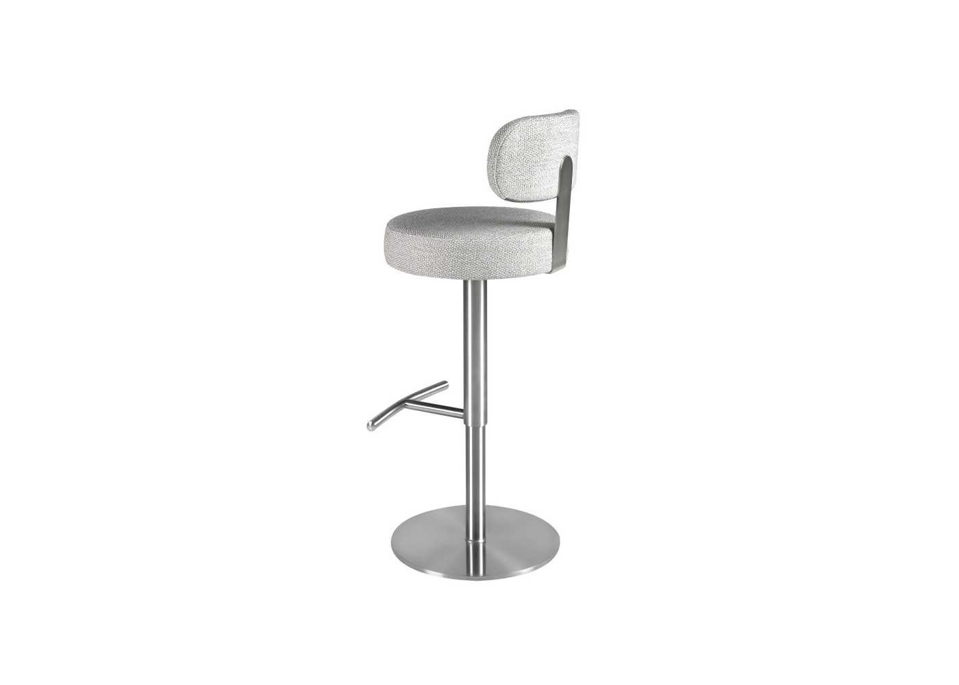 Tabouret pivotant élégant et moderne avec assise réglable en hauteur. Tapissé en tissu. Piètement et structure du dossier en acier inoxydable.