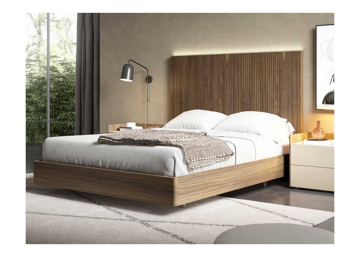 Lit design complet en chêne et finitions laquées avec éclairage LED, tables de chevet...