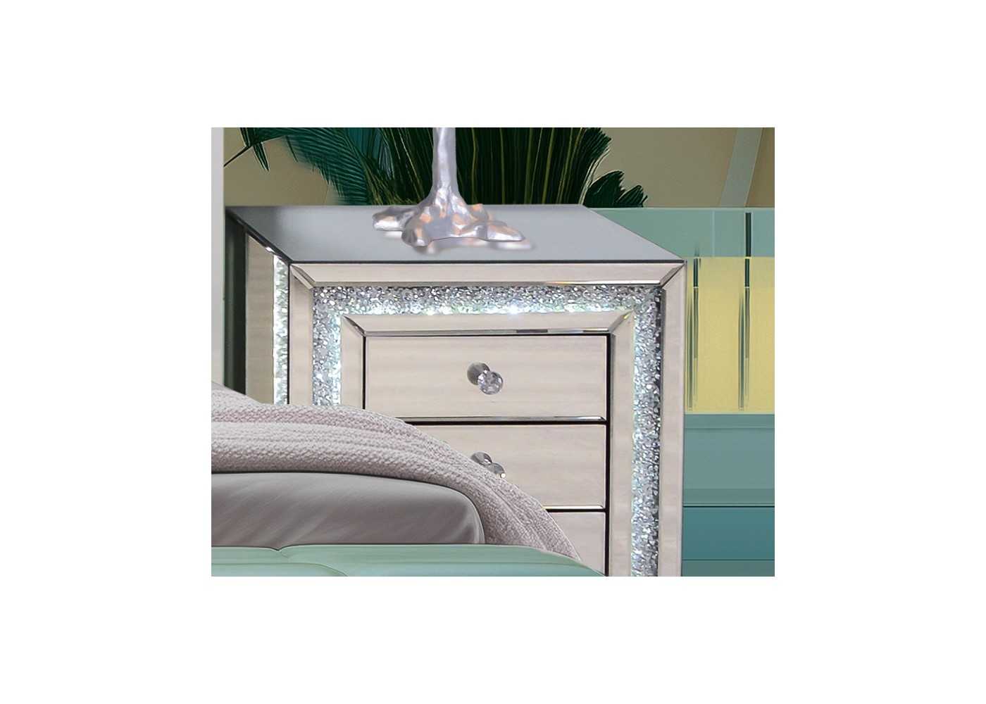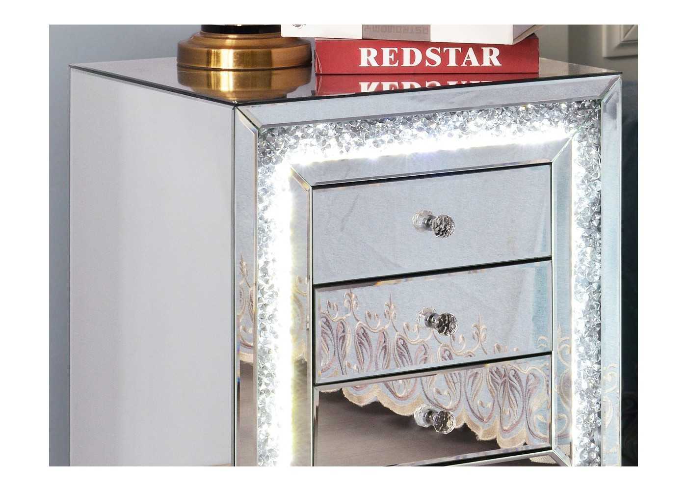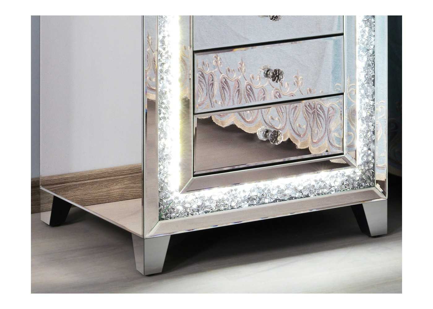 Table de nuit élégante et originale à 3 tiroirs doublée d'un miroir avec lumière LED intégrée dans le cadre et détail de petits cristaux. Poignées en verre et Bluetooth intégré.