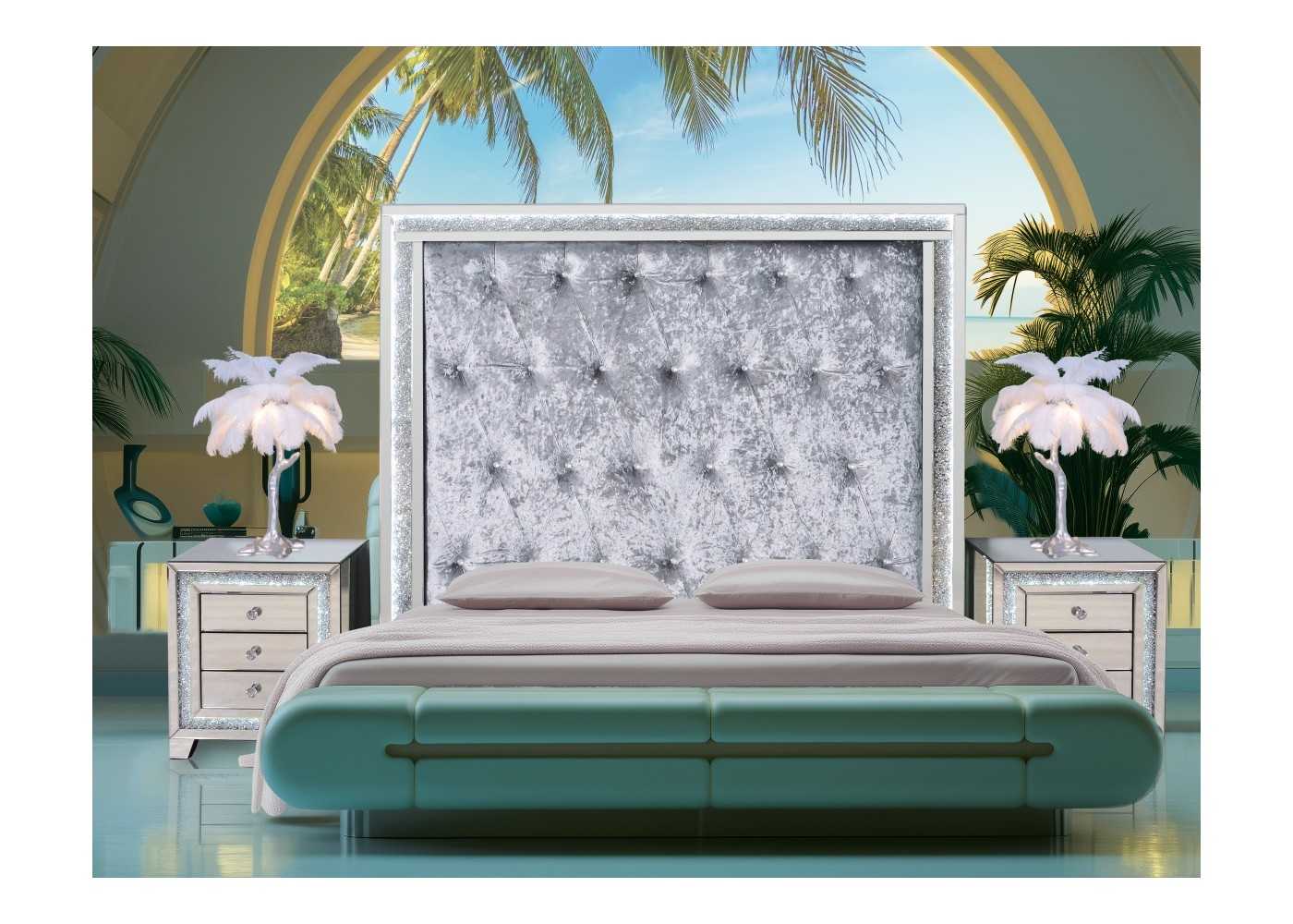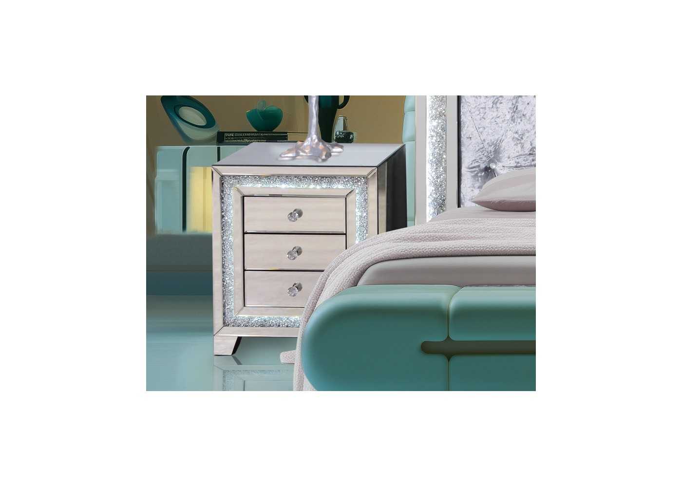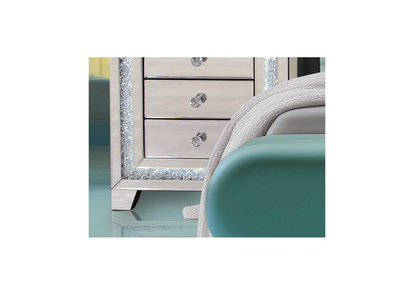 Table de nuit élégante et originale à 3 tiroirs doublée d'un miroir avec lumière LED intégrée dans le cadre et détail de petits cristaux. Poignées en verre et Bluetooth intégré.
