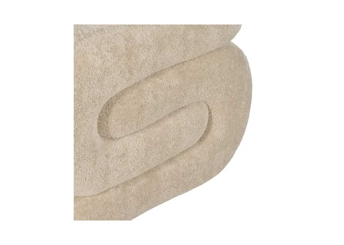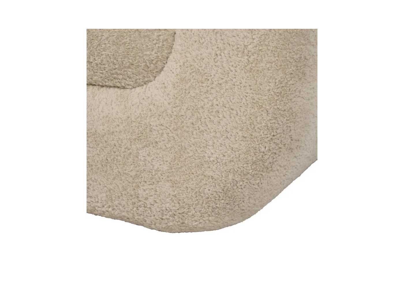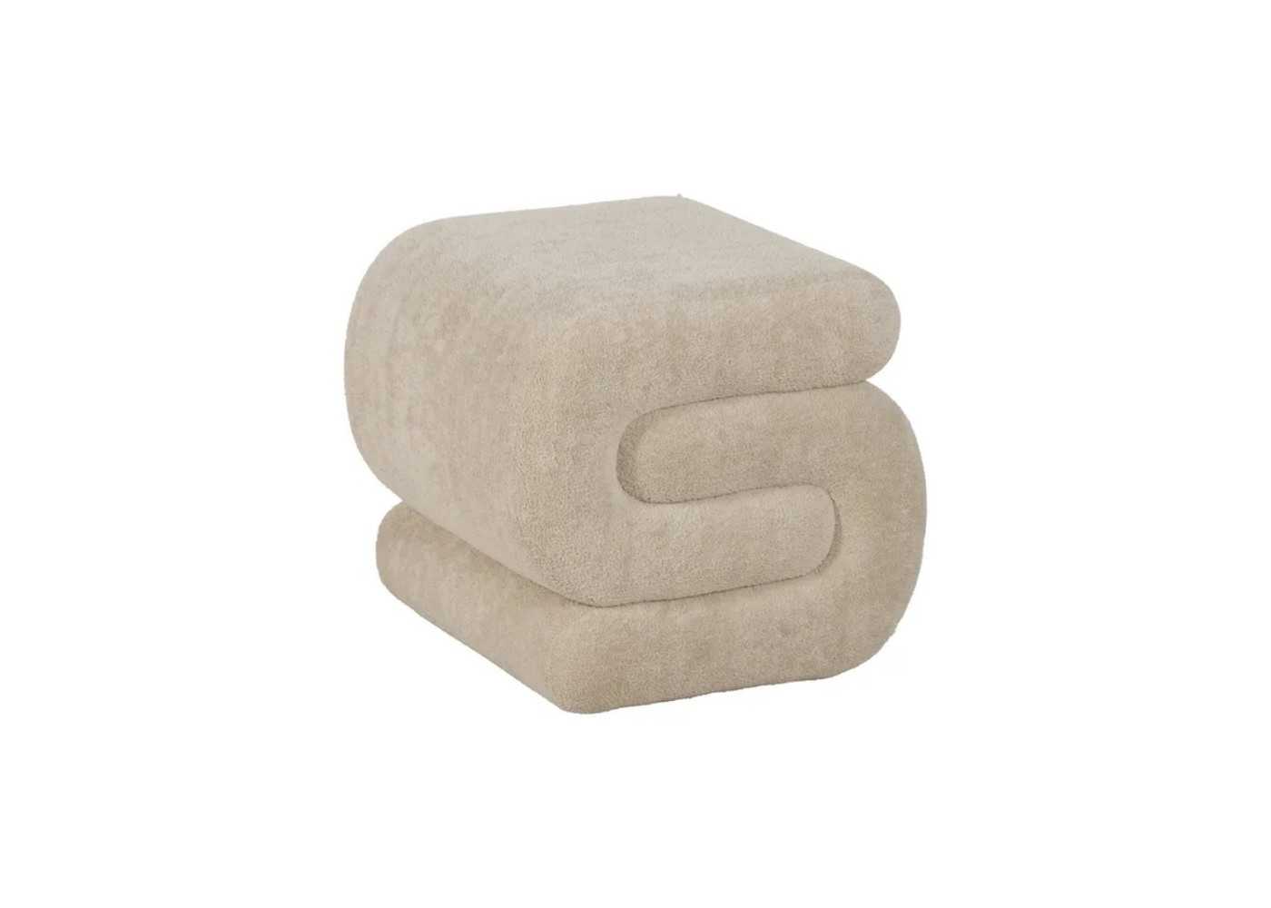 Pouf au design moderne en bois de pin avec tapissé en tissu bouclé beige.