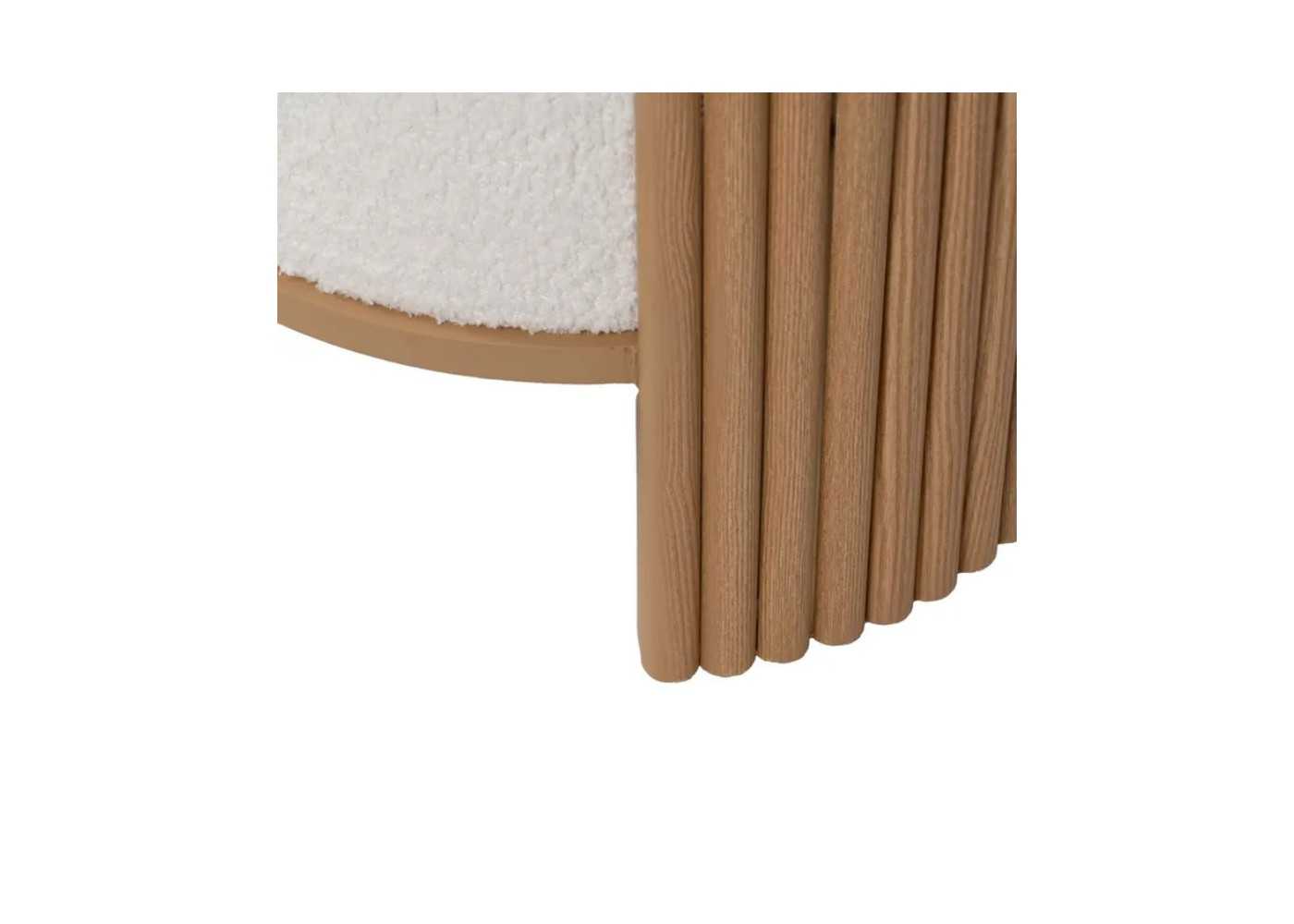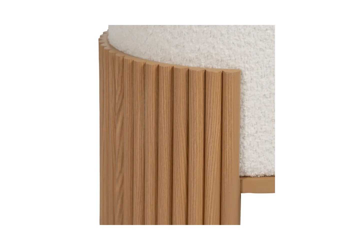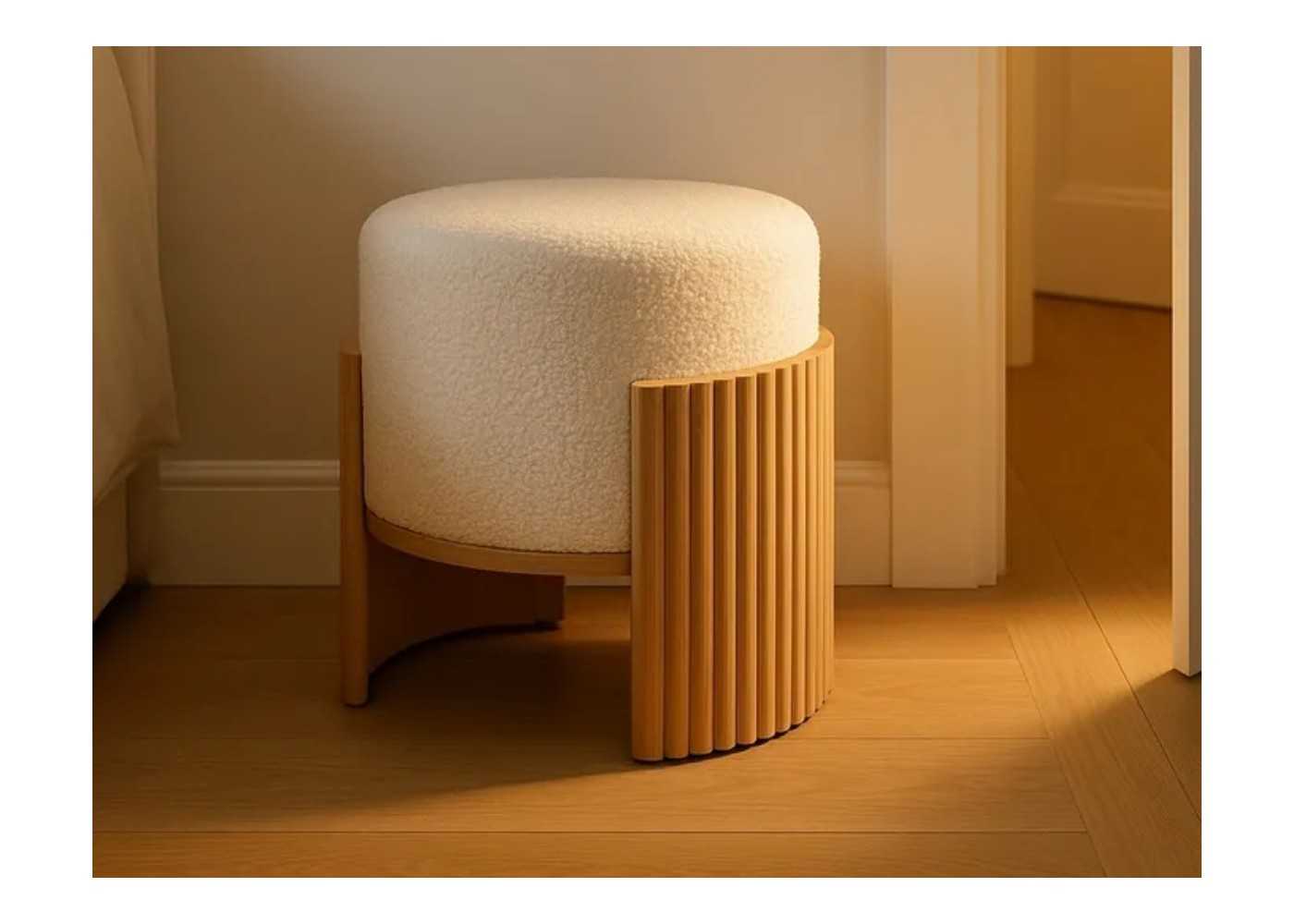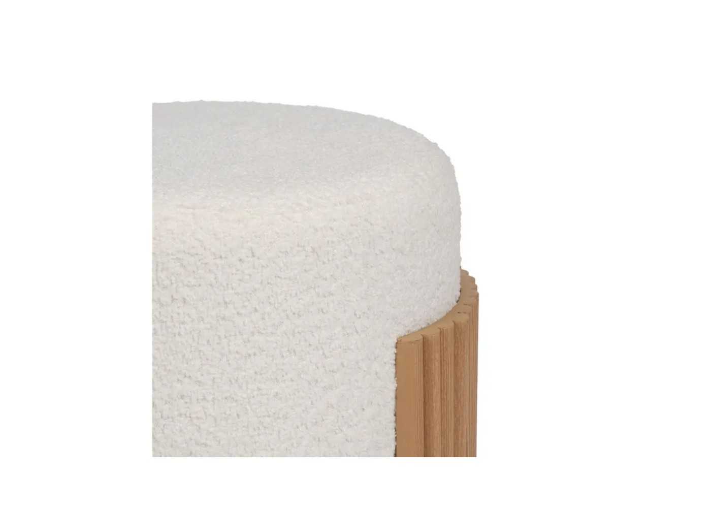 Pouf rond au design moderne réalisé avec une structure en bois de pin à lattes de couleur naturelle et tapissé de tissu chenille 100% polyester d'une densité de 510 gr en blanc.