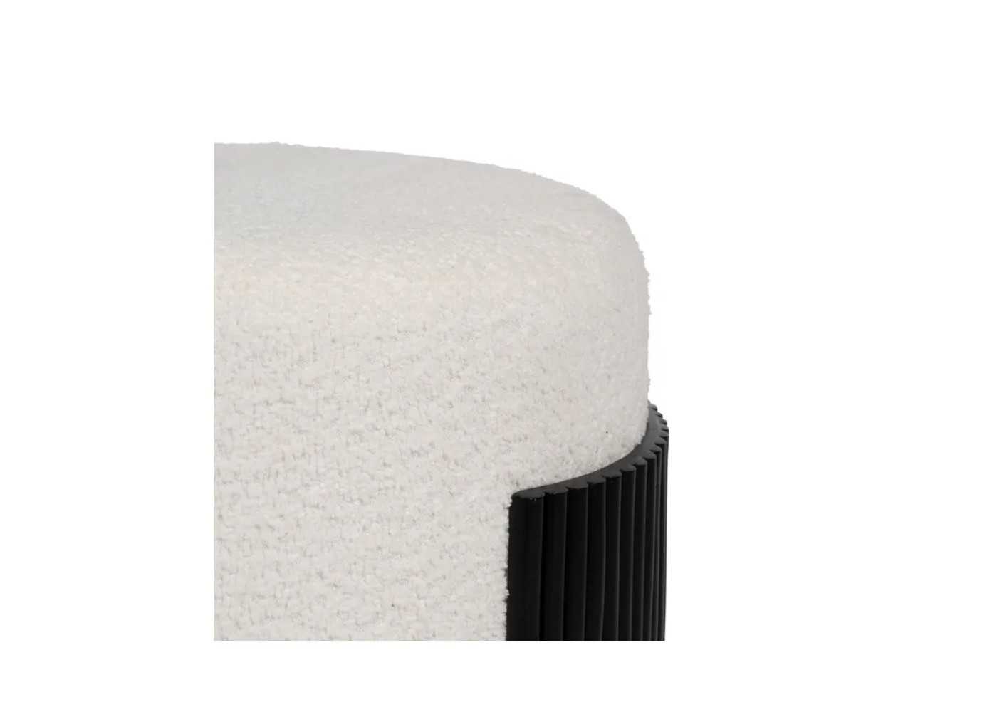 Pouf rond au design moderne réalisé avec une structure en bois de pin à lattes de couleur laquée noire et tapissé de tissu chenille 100% polyester d'une densité de 510 gr en blanc.