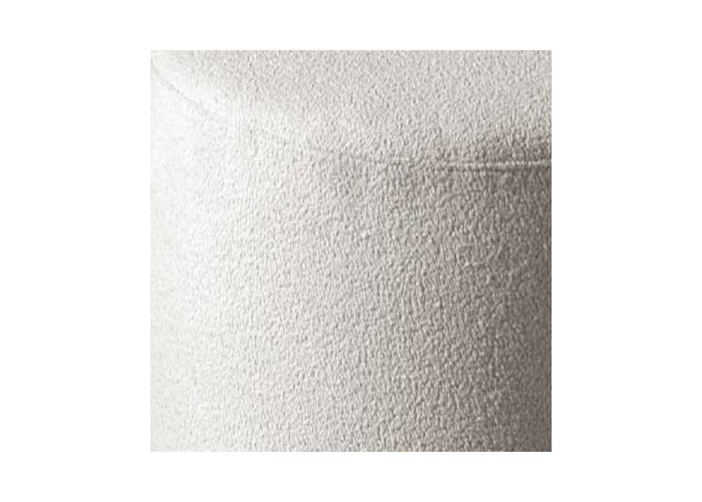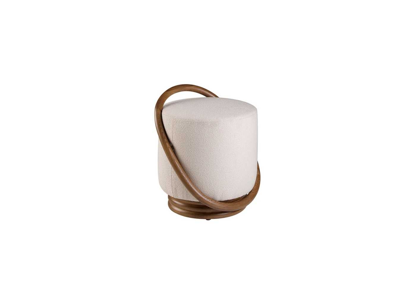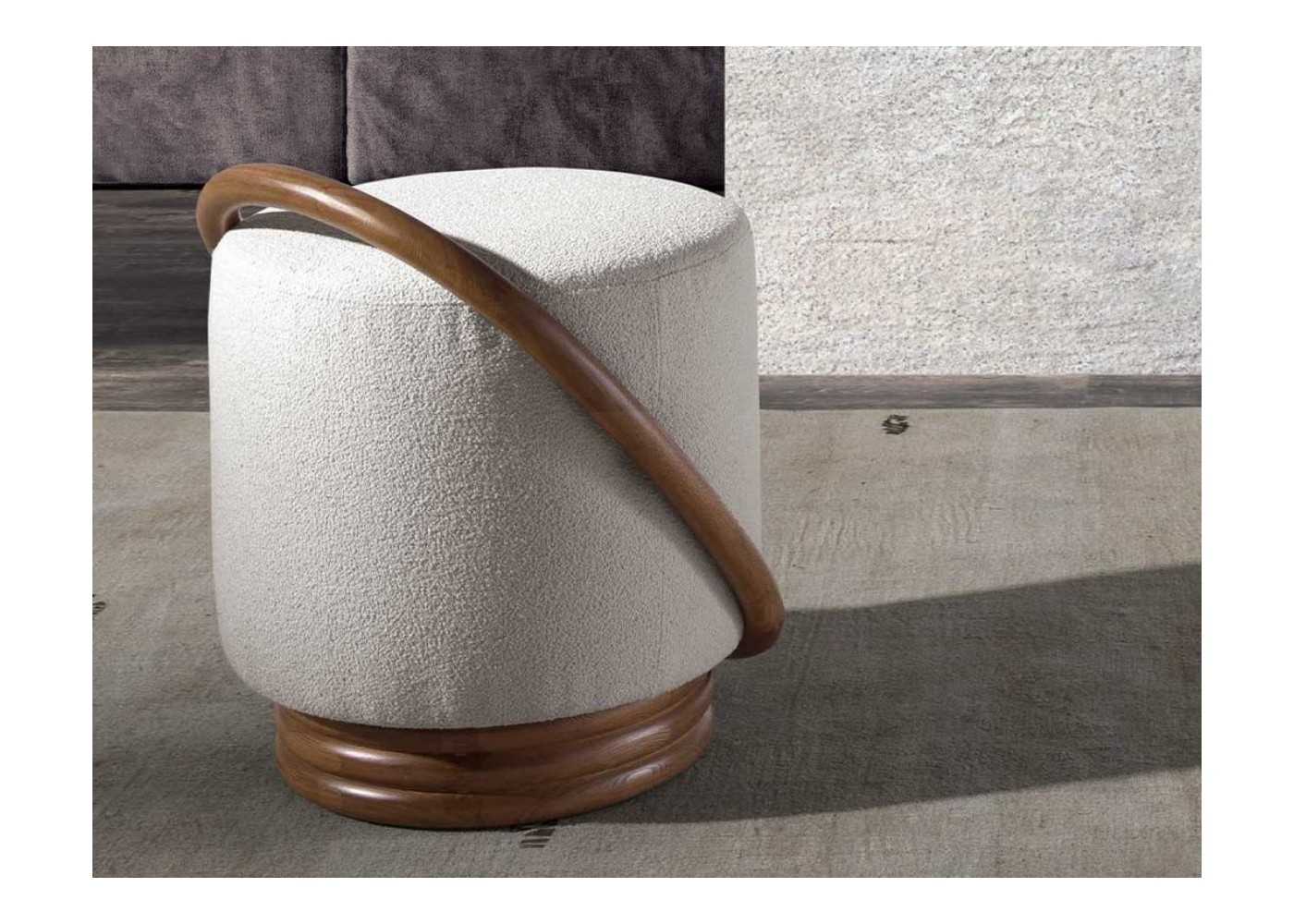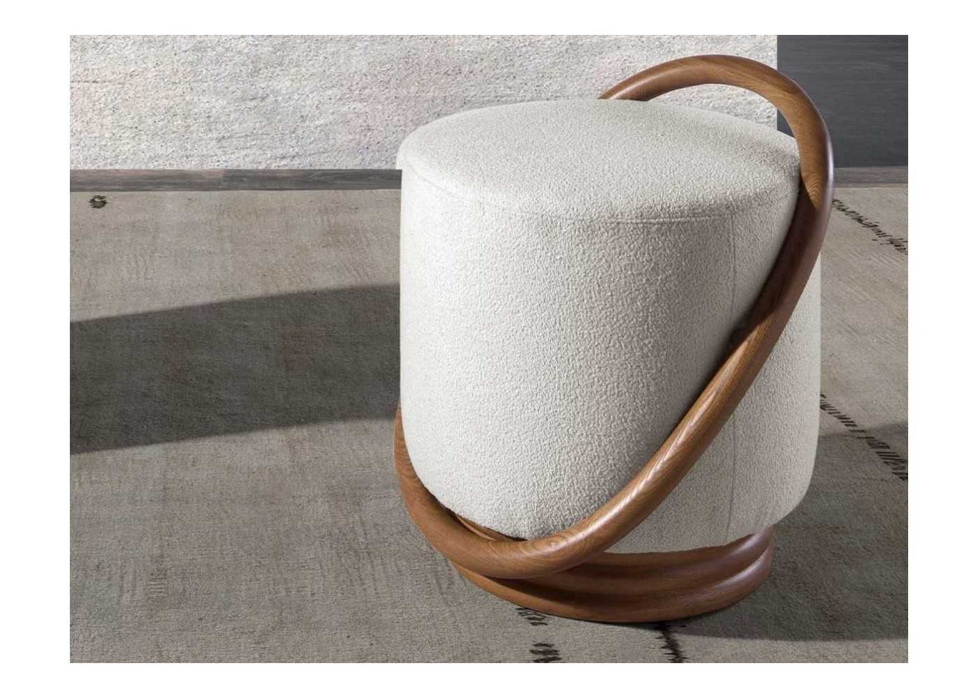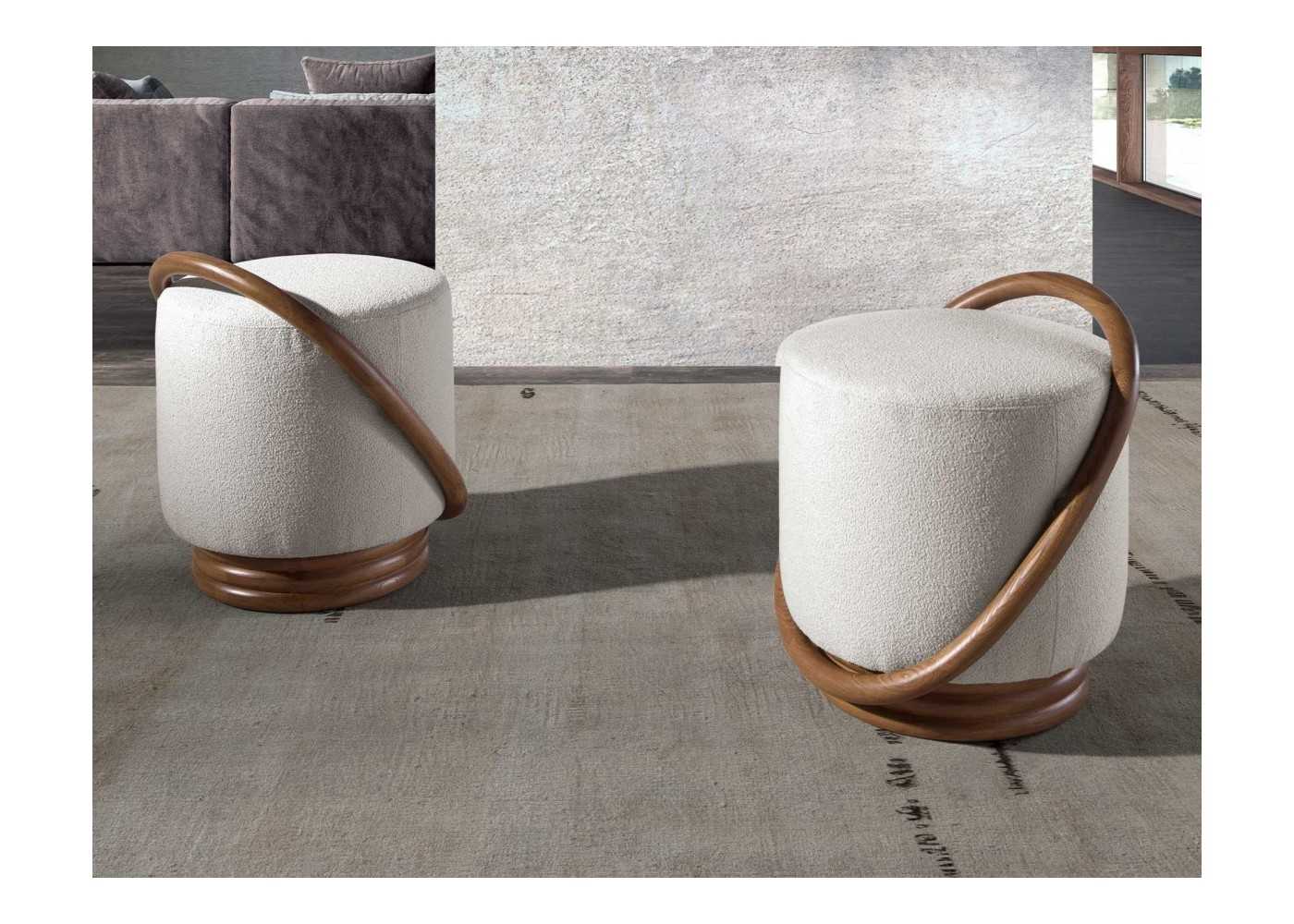 Pouf élégant tapissé de tissu blanc avec une base en bois massif couleur noyer aux lignes arrondies.