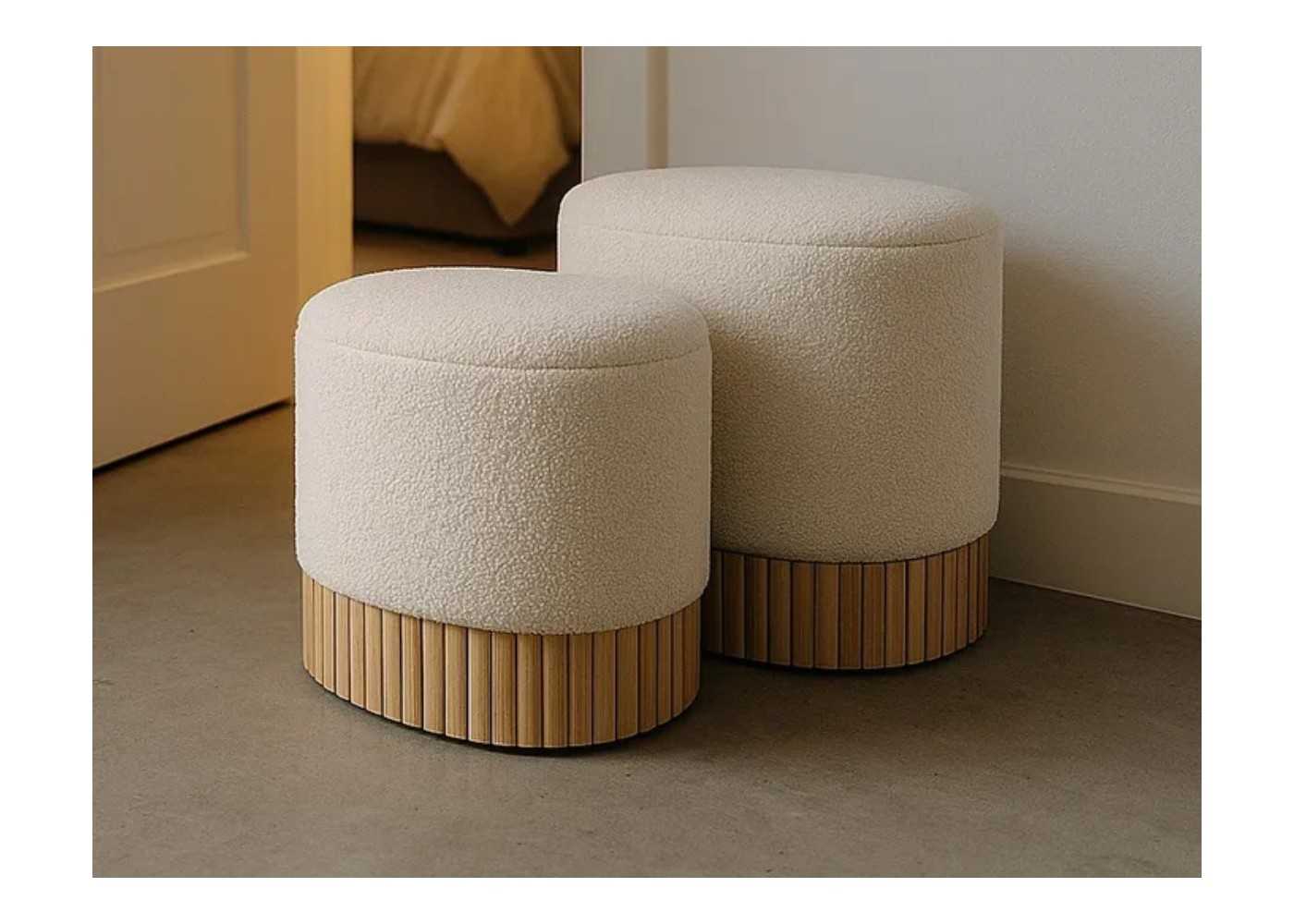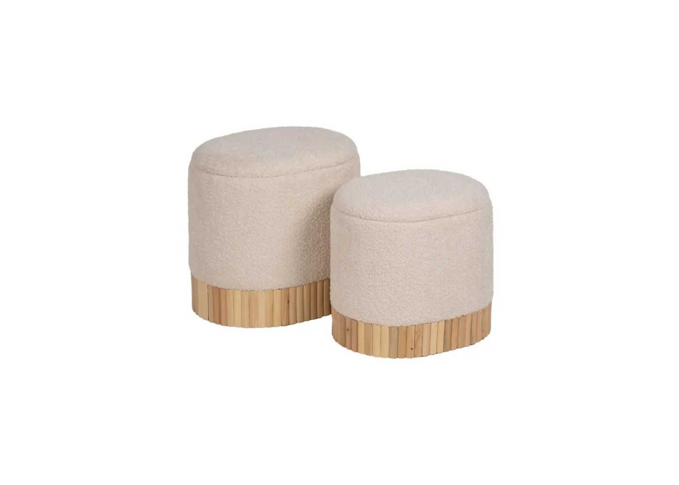 Ensemble élégant composé de deux poufs ovales avec compartiments de rangement de différentes tailles. Tapissé d'un tissu bouclé couleur crème, ils sont ornés de détails sur le sommier à lattes en bois.