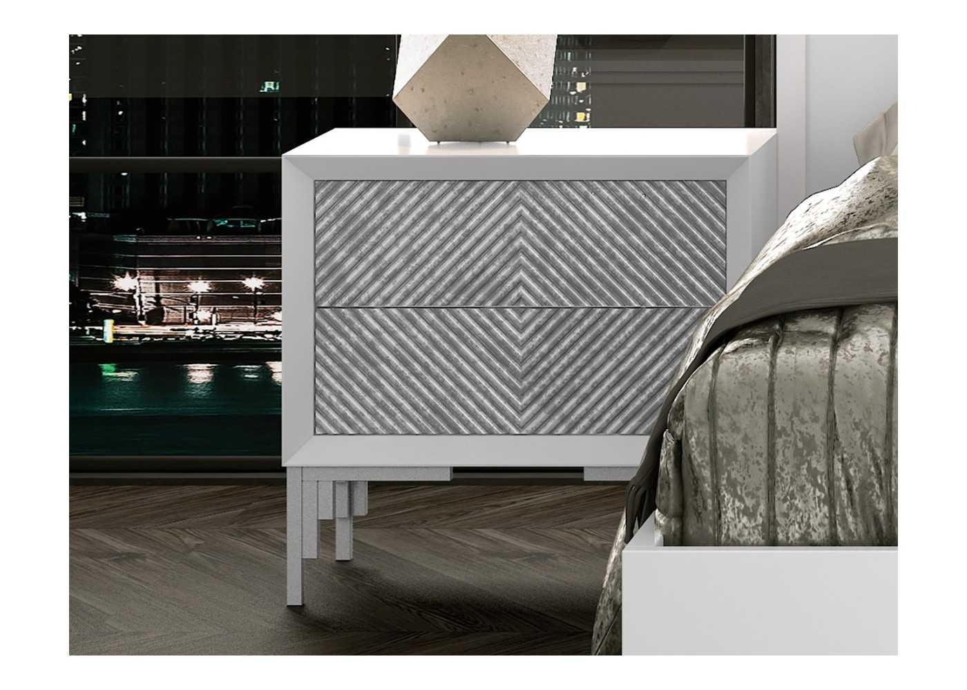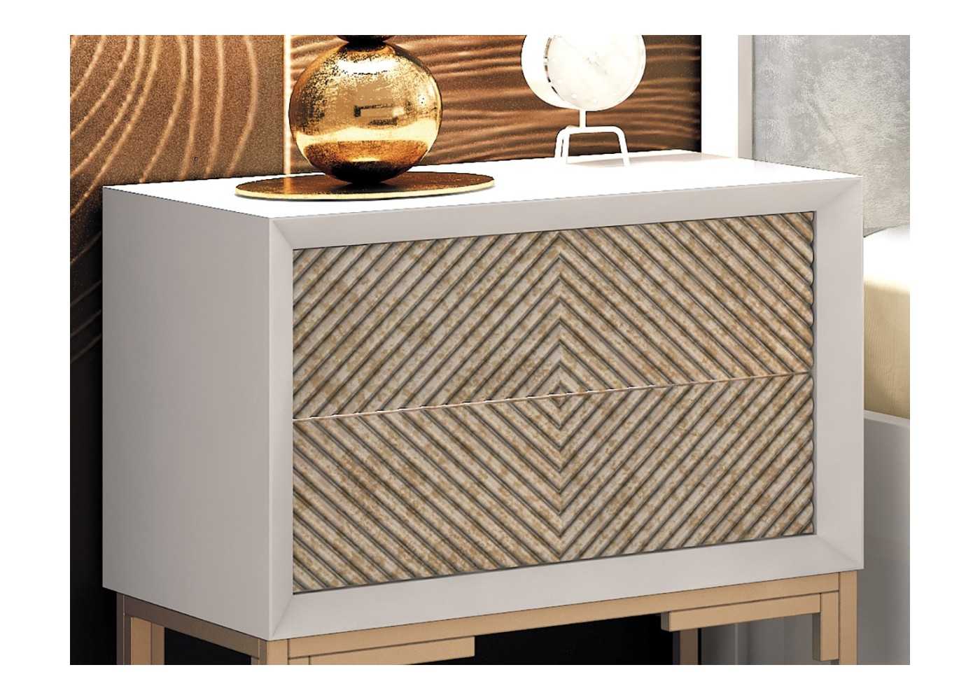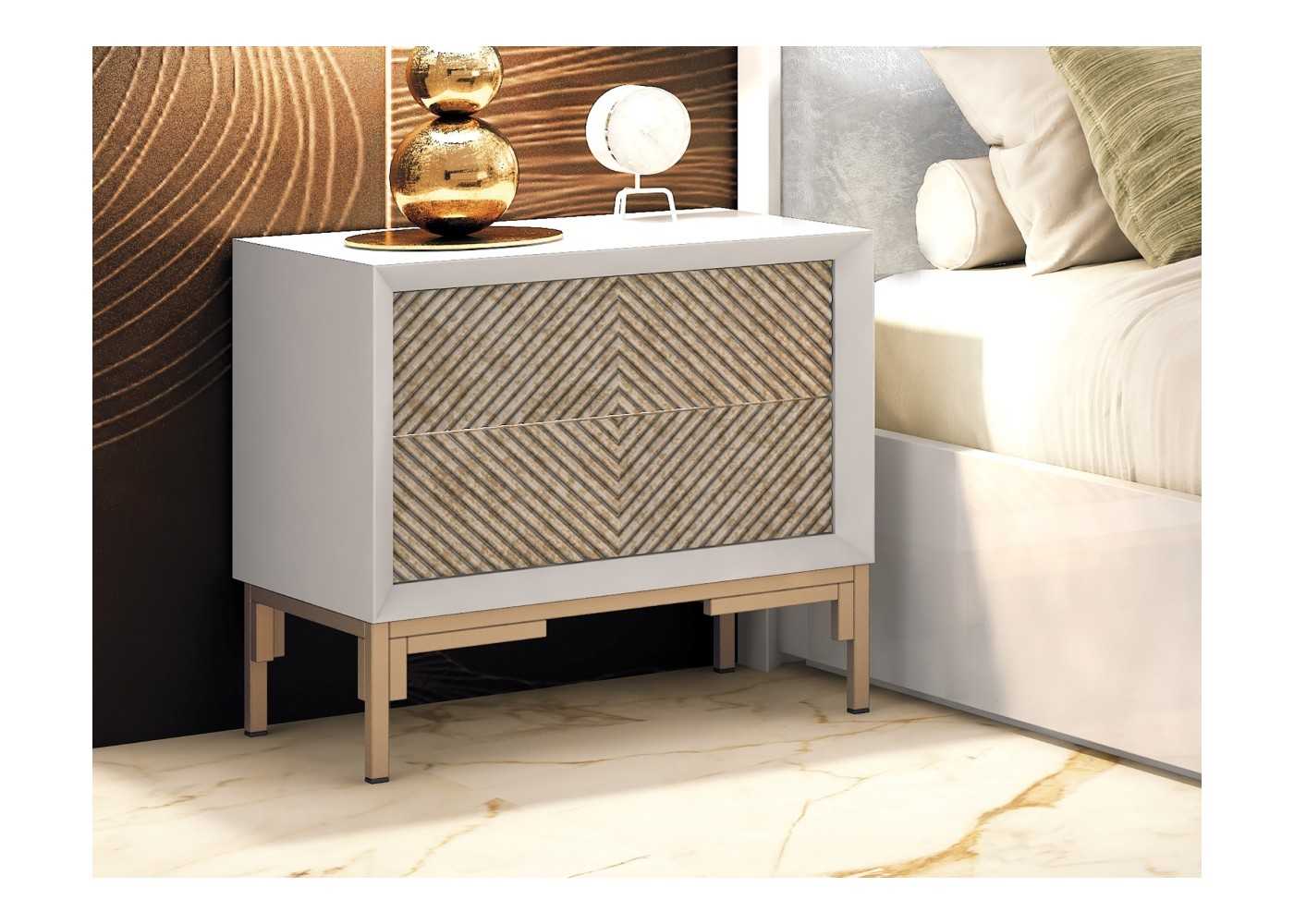 Élégante table de chevet à 2 tiroirs au design moderne. Laquée en blanc pur, ses façades de tiroirs arborent un motif original en losanges couleur marbre champagne. Piètement en acier laqué champagne.