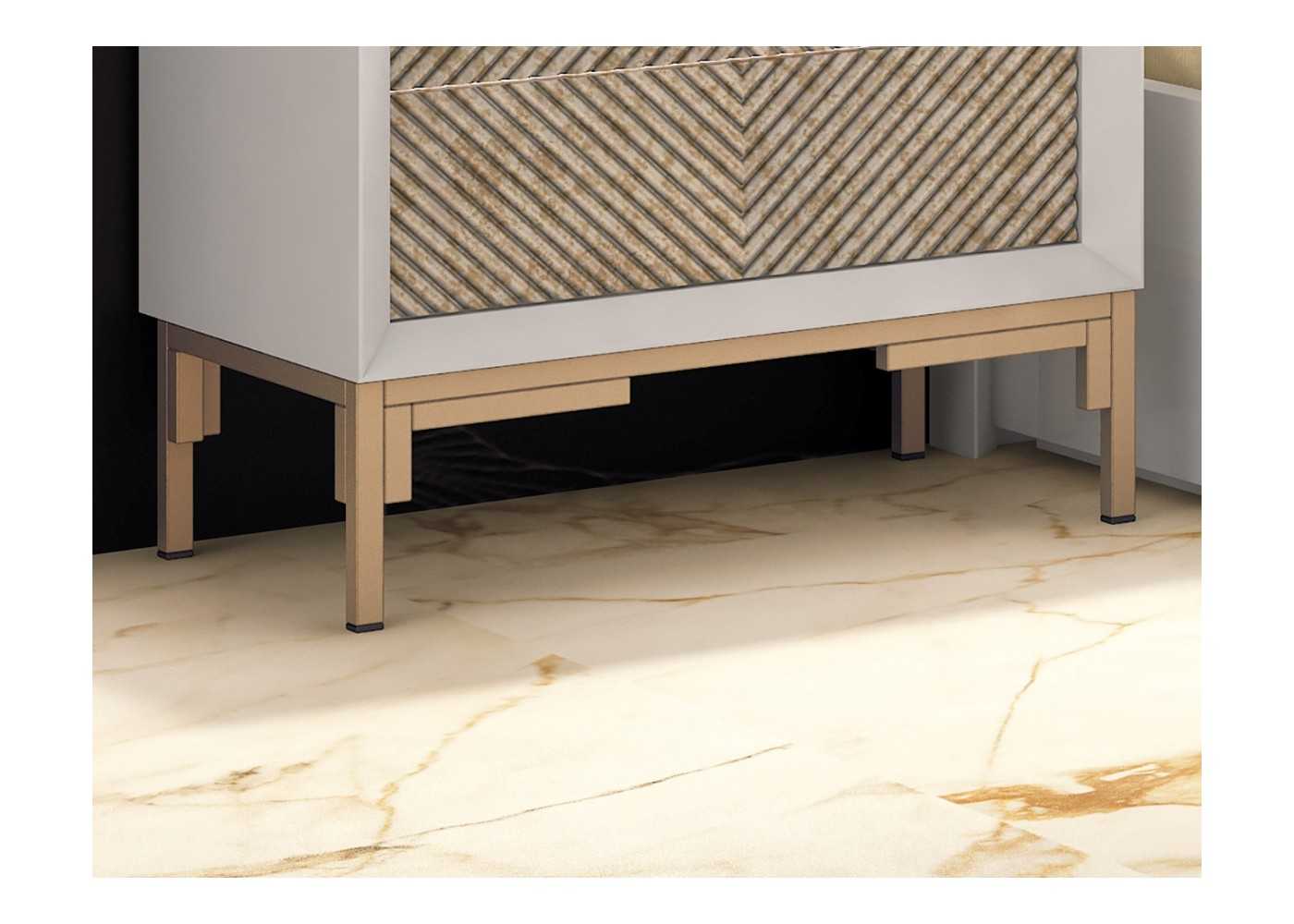Façade des tiroirs avec un motif original en losanges de couleur marbrée champagne. Possibilité de marbré argent sans supplément de prix.