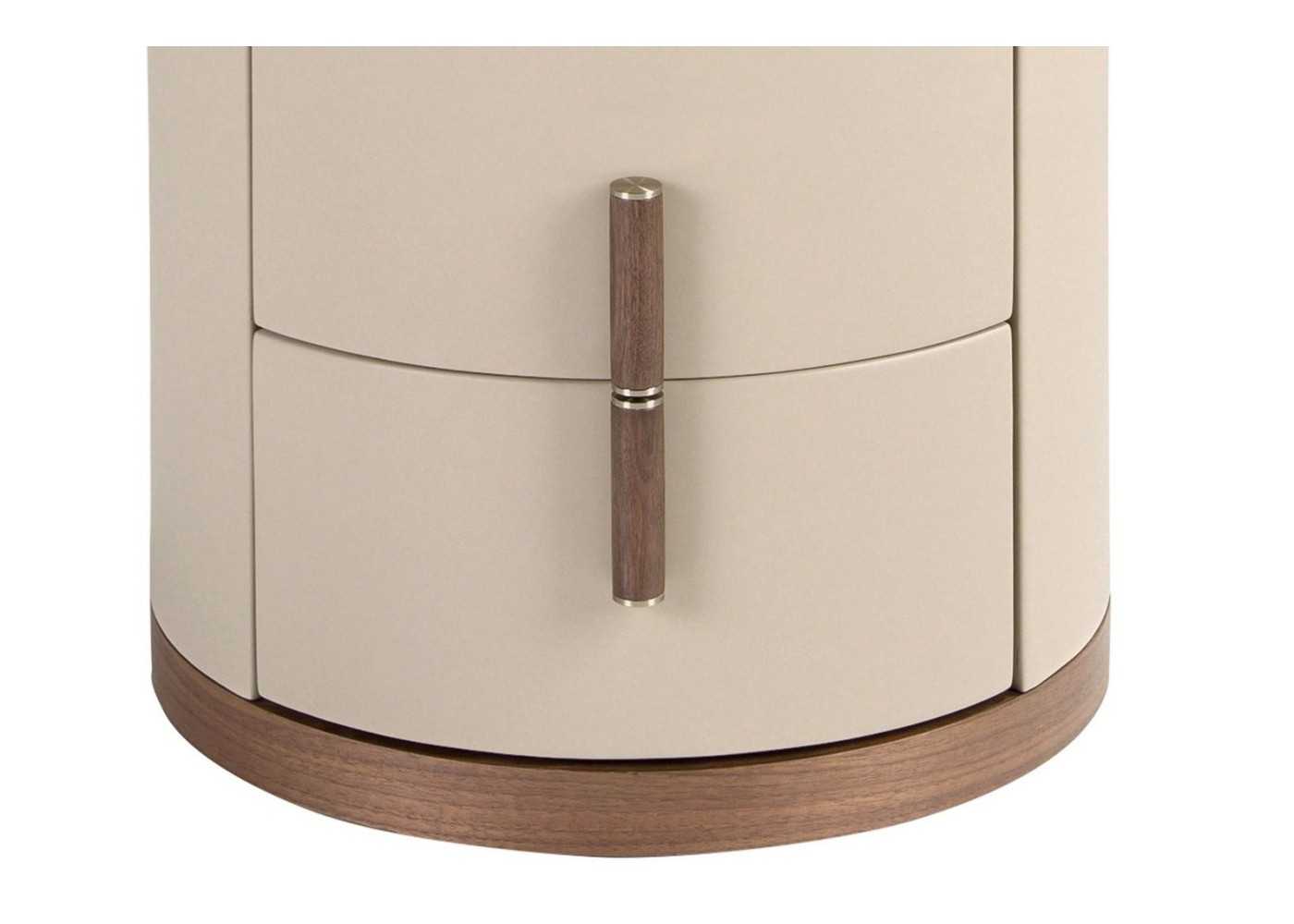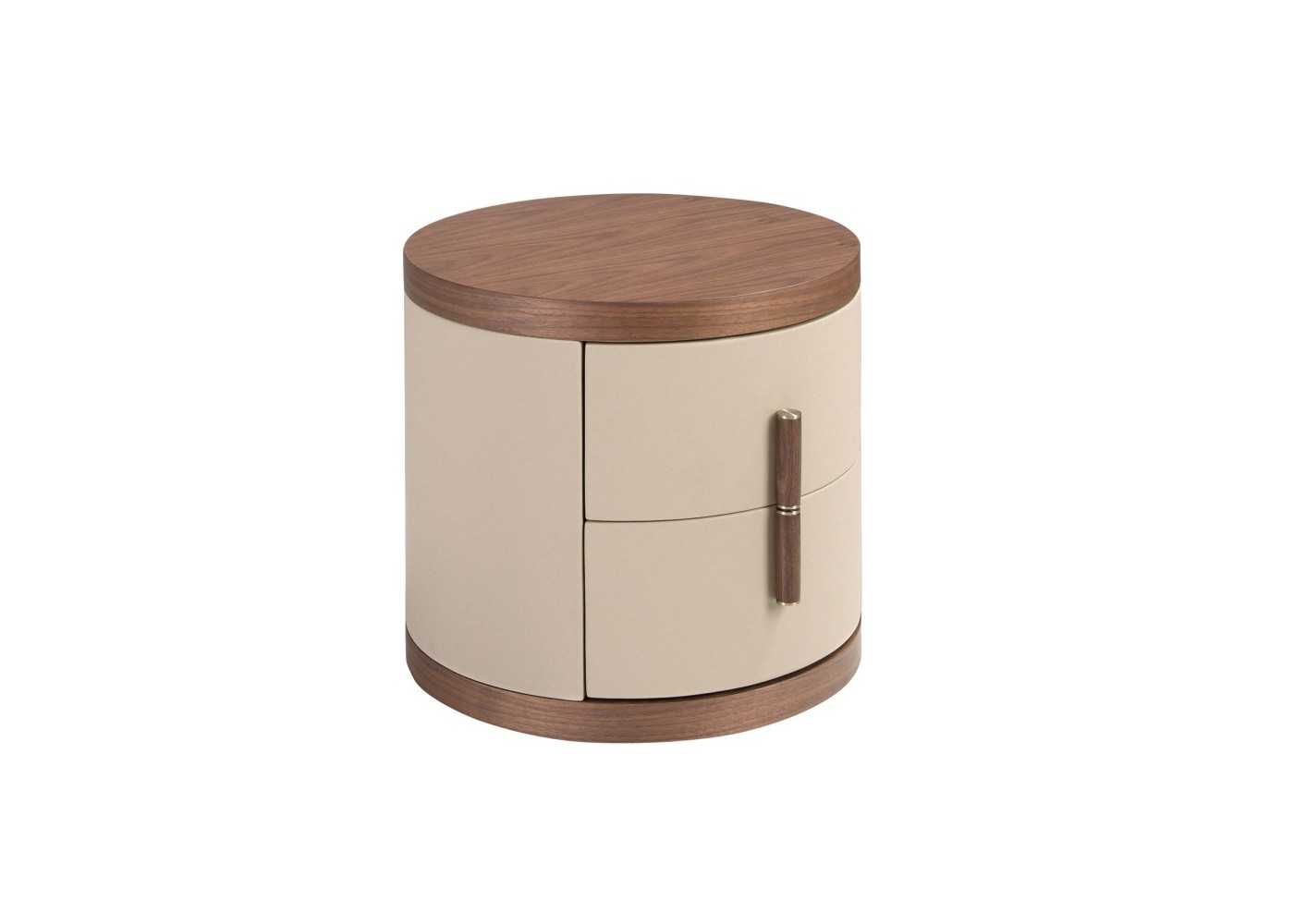 Élégante table de chevet ronde à 2 tiroirs, au design moderne, revêtue de cuir synthétique, avec socle et plateau en frêne massif plaqué noyer naturel.
