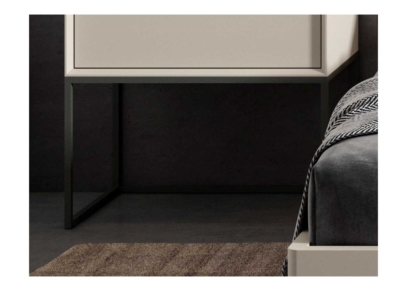 Table de chevet à 1 tiroir, laquée avec bords biseautés et base en acier inoxydable laqué couleur graphite.
