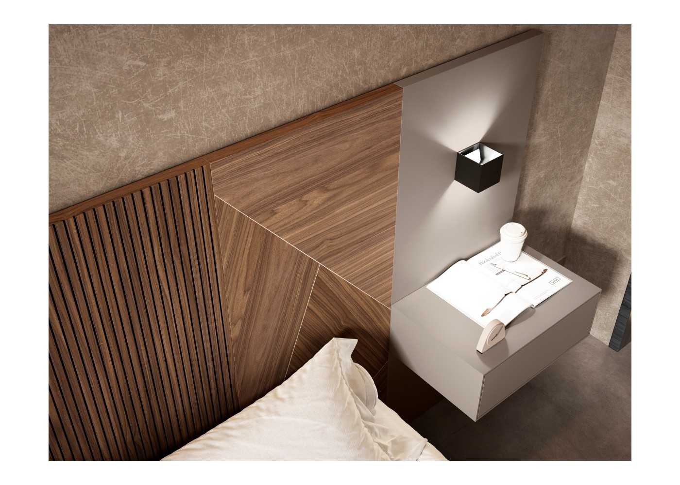 Lit complet élégant et remarquable avec tête de lit XXL élégante avec panneau central en lattes de chêne américain et marqueterie de chêne américain sur les côtés. Panneaux latéraux laqués avec tables de chevet suspendues, chacune dotée d'un tiroir, d'un éclairage LED intégré et un sommier flottant laqué couleur vison mat.