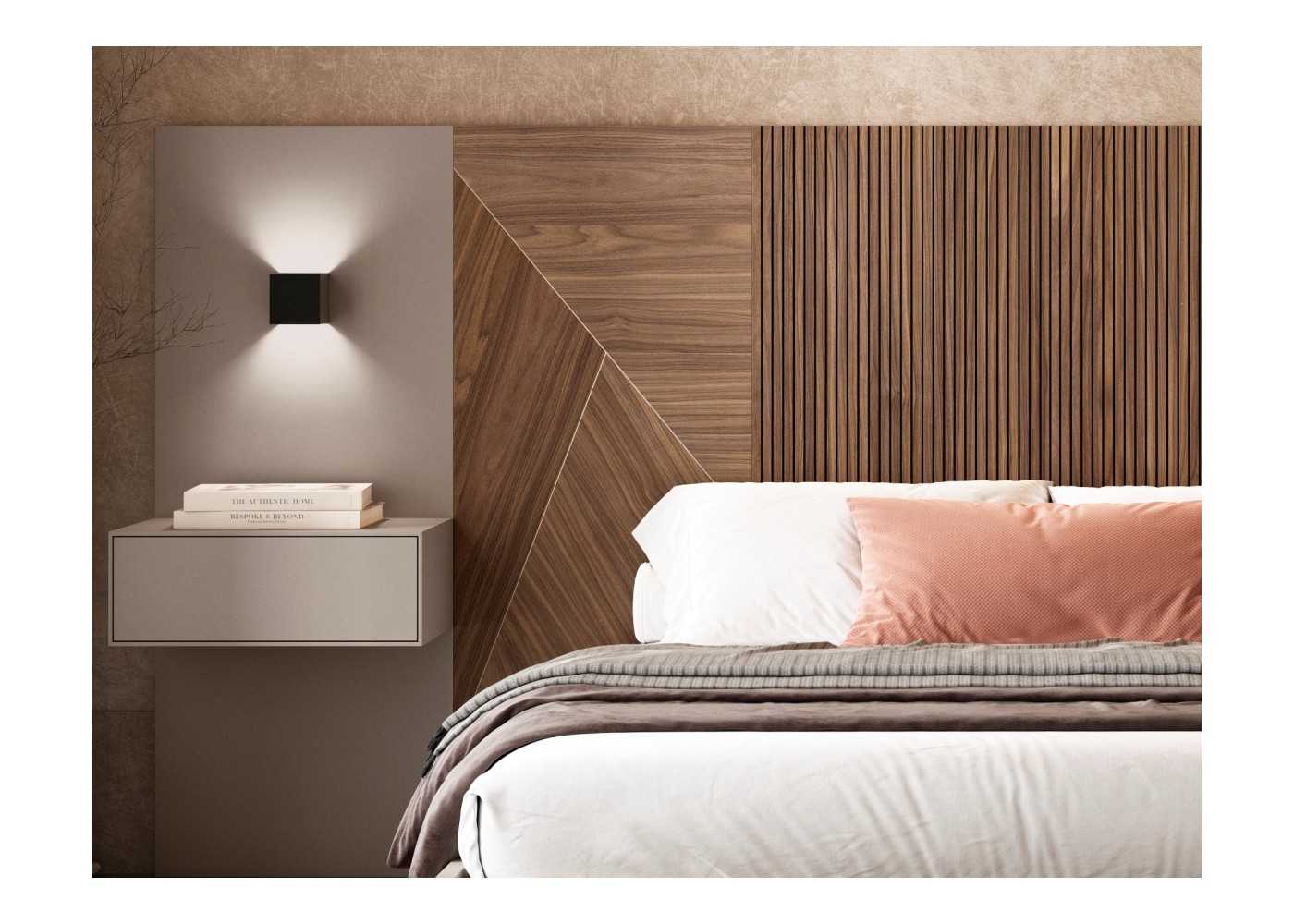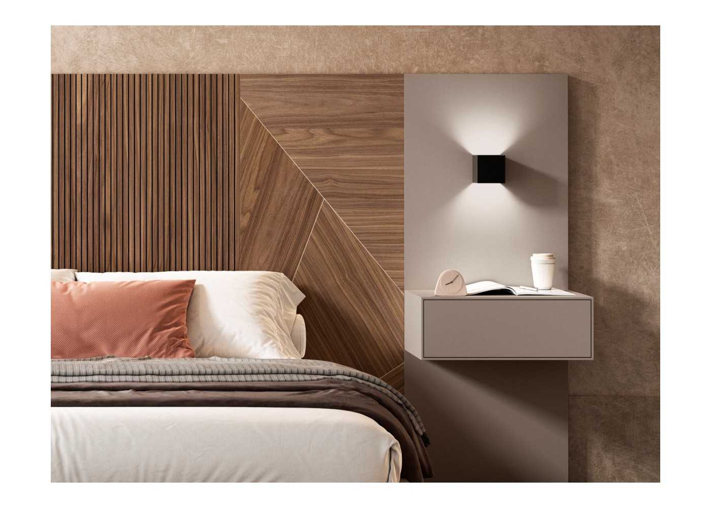 2 panneaux latéraux extérieurs en FIBRALAC, laqués en vison mat, avec tables de chevet suspendues, chacune dotée d’un tiroir, et deux appliques murales en acier noir époxy