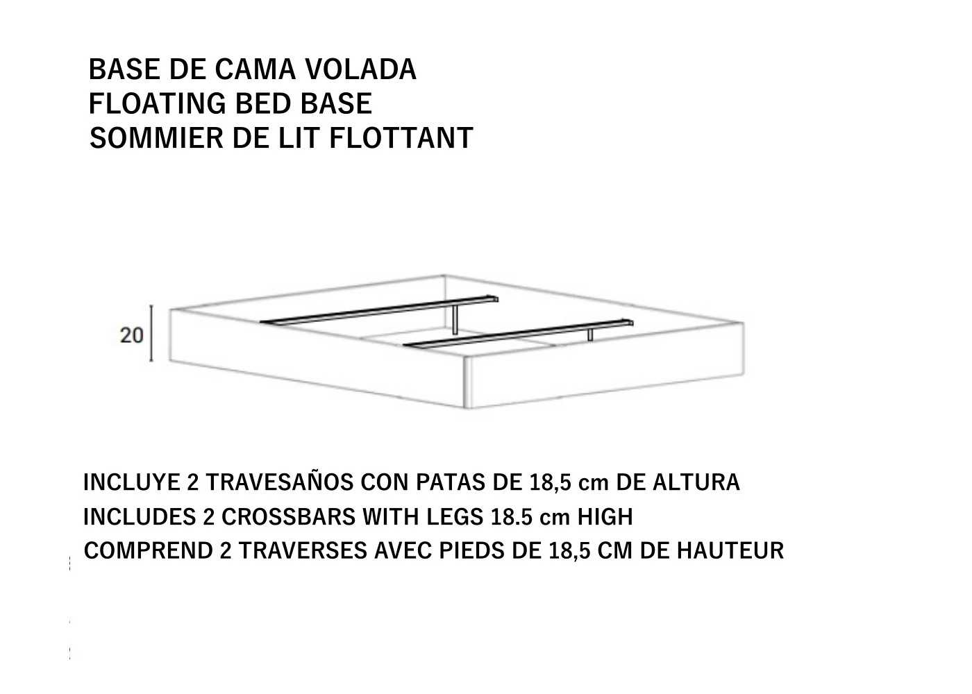 Sommier flottant laqué aux angles arrondis. Le sommier comprend deux traverses avec des pieds de 18,5 cm de hauteur.