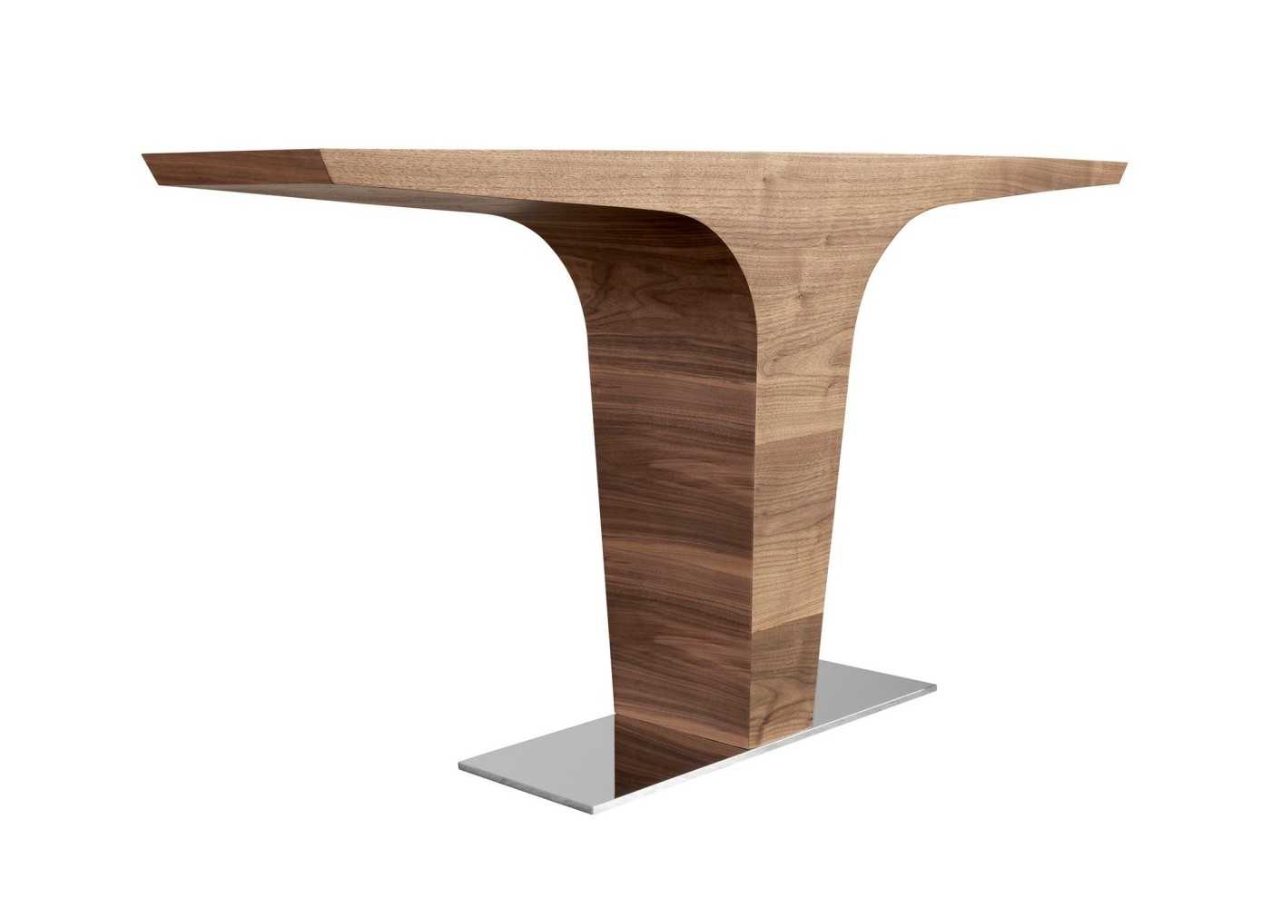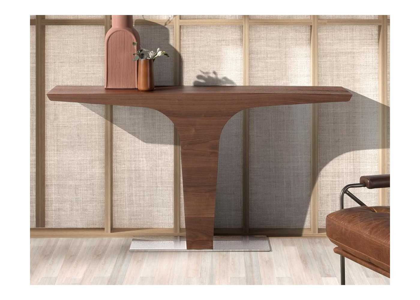 Console au design moderne en placage de noyer naturel avec une base en acier inoxydable chromé.