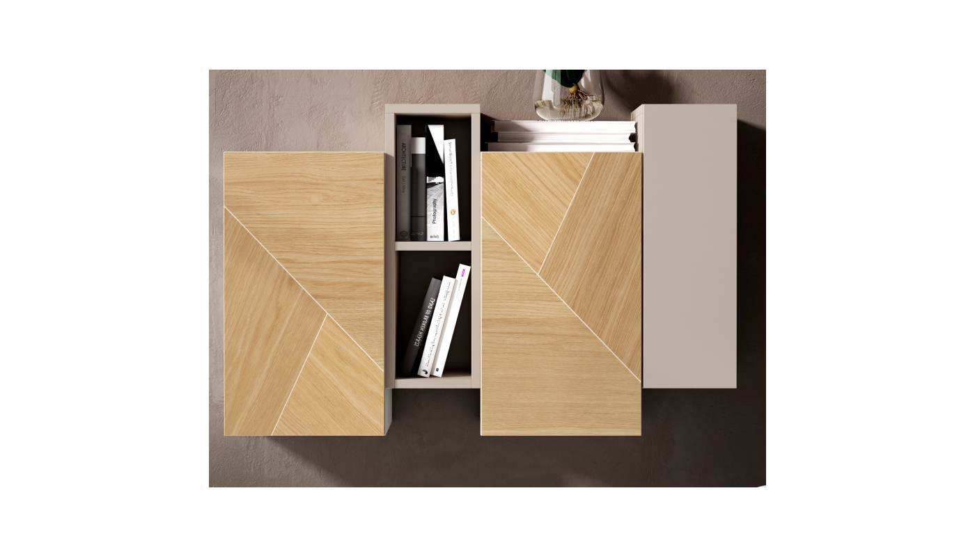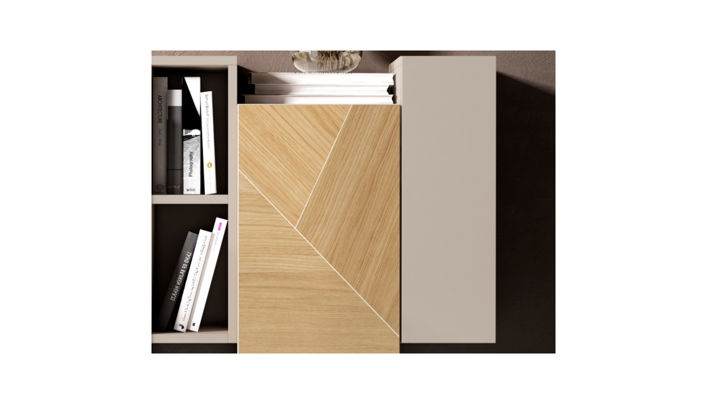 Structure finie en laqué vison mat avec façade des portes en placage naturel de marqueterie de chêne. Possibilité de choisir différents placages et laques sans