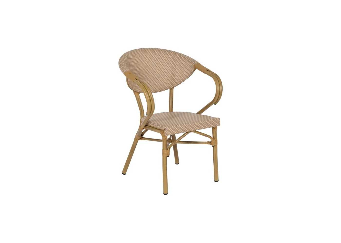 Chaise d'extérieur avec accoudoirs en aluminium, assise et dossier en textilène couleur beige.