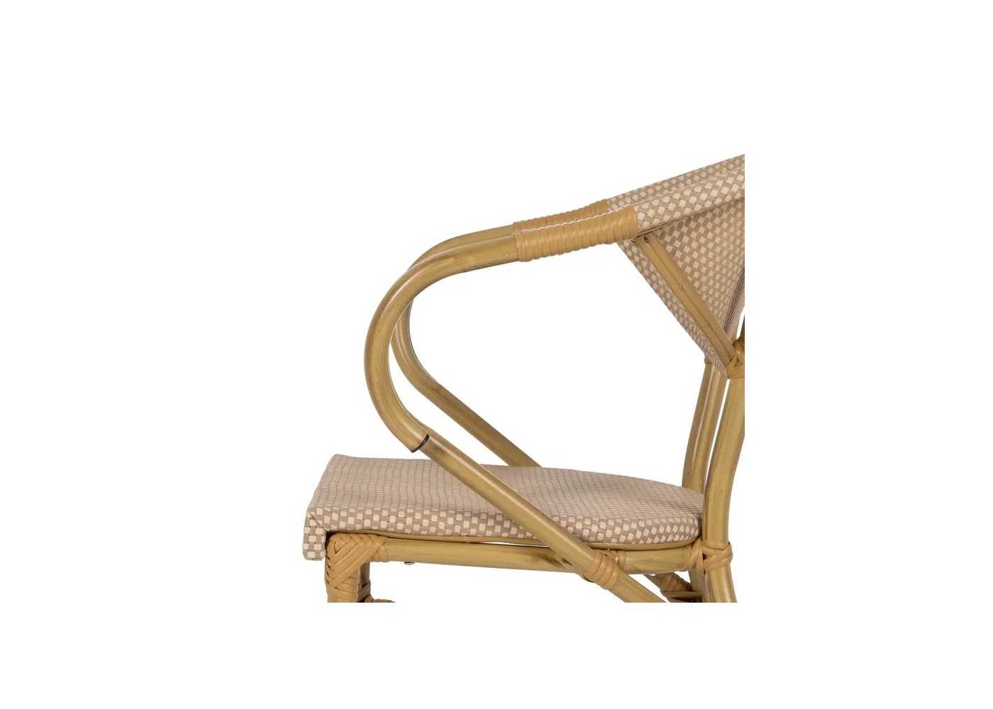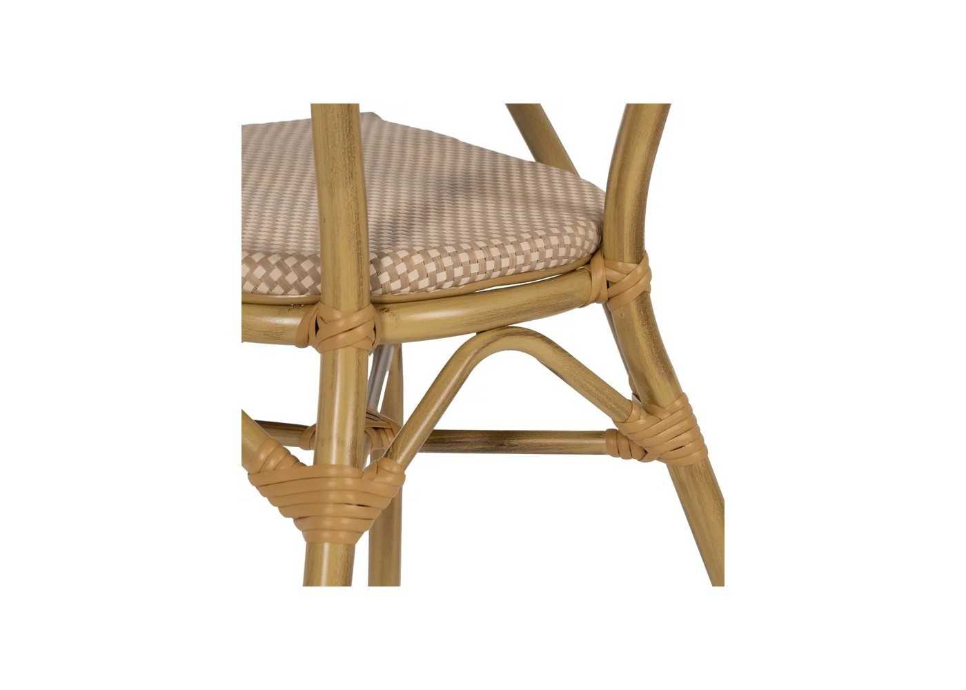 Chaise d'extérieur originale et confortable avec accoudoirs, fabriquée en aluminium imitant le bambou de couleur naturelle avec des détails en rotin synthétique.