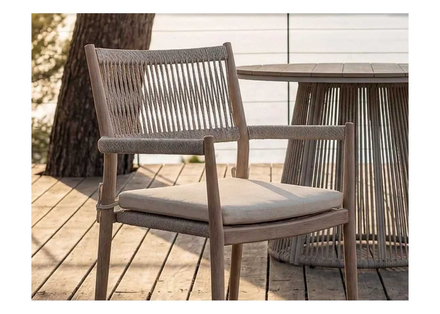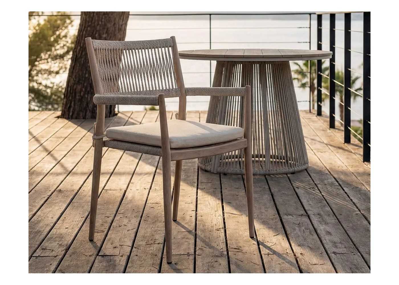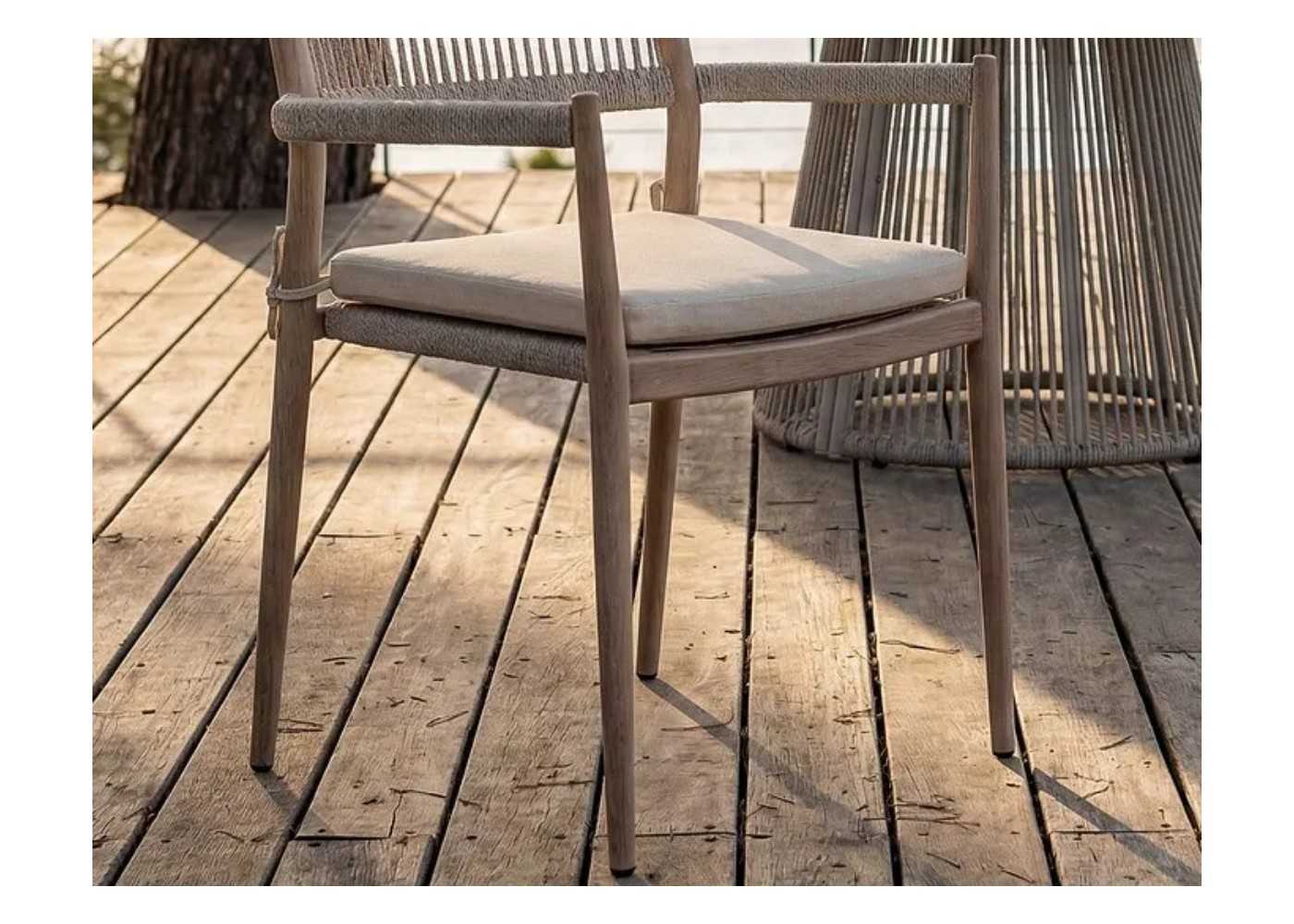 Chaise d'extérieur élégante et fonctionnelle avec accoudoirs, structure en acier laqué avec rotin PE et coussin d'assise de couleur beige clair.