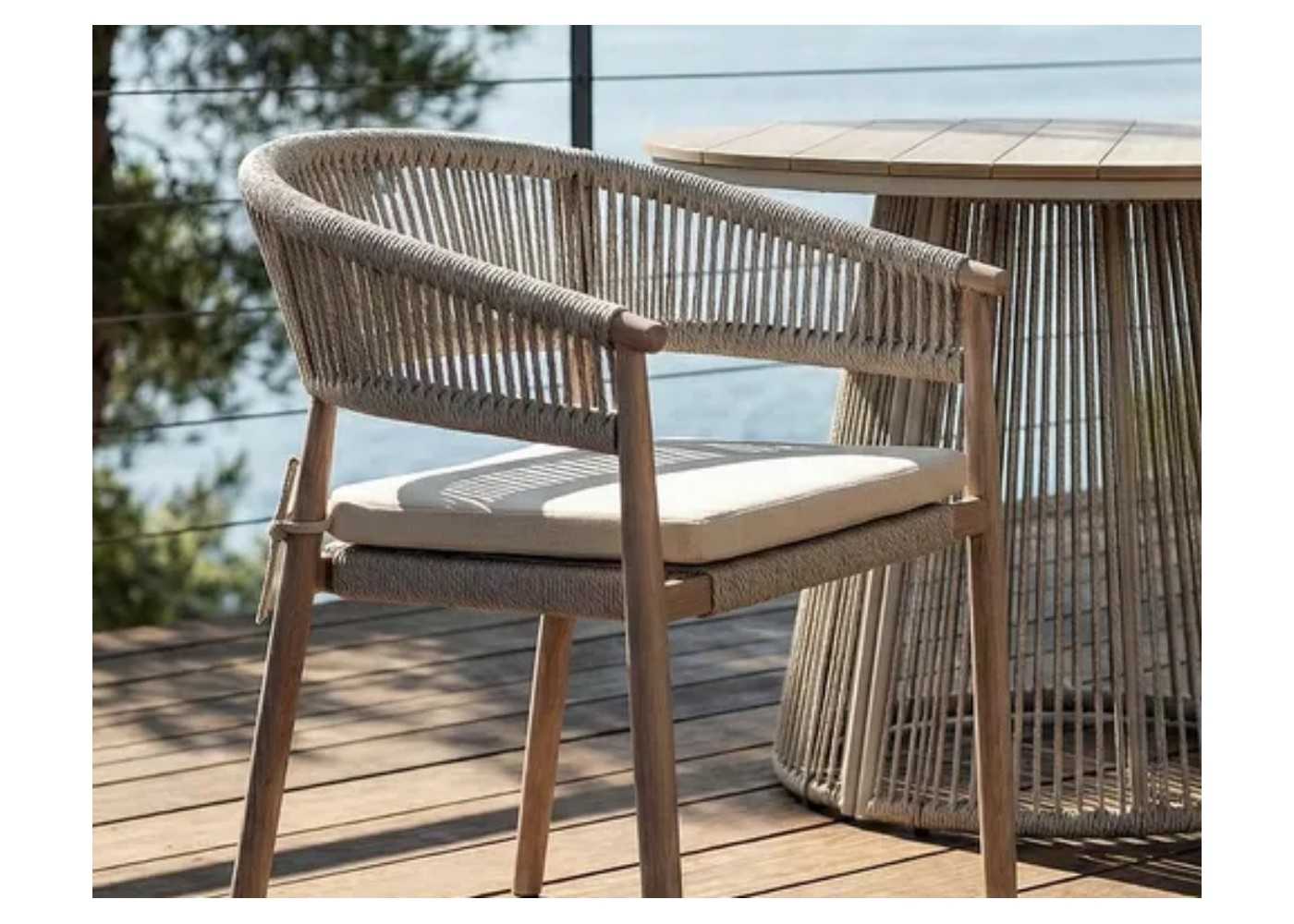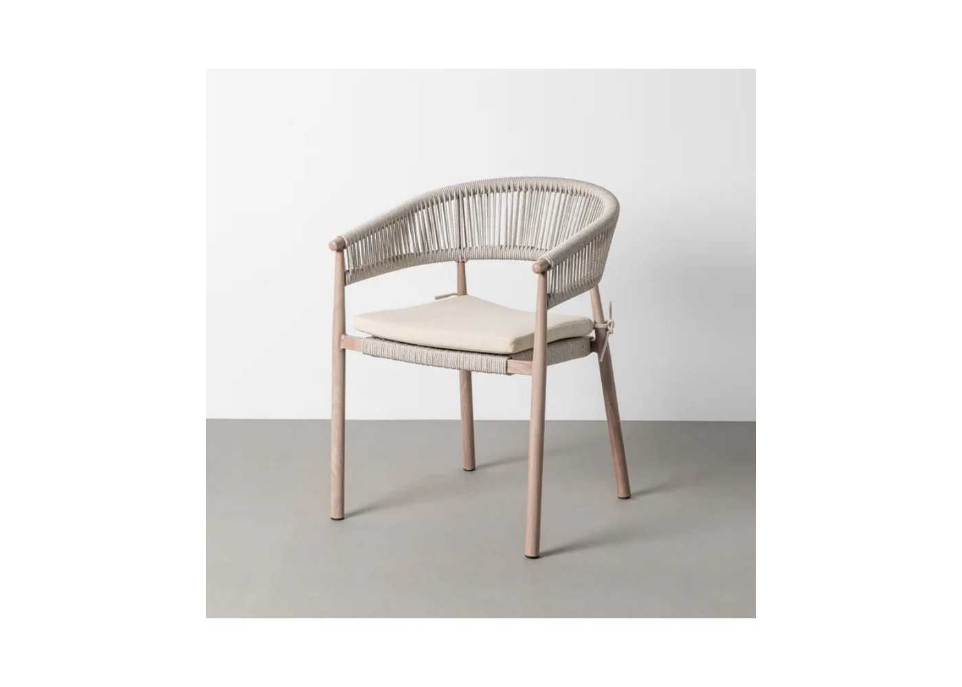 Chaise d'extérieur élégante et fonctionnelle avec accoudoirs, structure en acier laqué avec rotin PE et coussin d'assise de couleur beige clair.