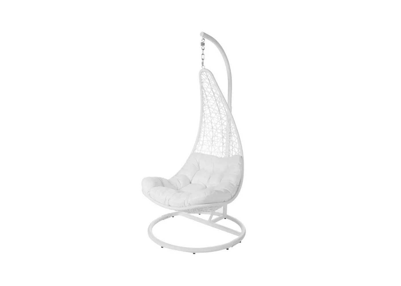 Fauteuil suspendu d'extérieur au design moderne avec mât en acier. Structure en acier laqué blanc et entrelacs en rotin synthétique PE et coussin d'assise de 16 cm d'épaisseur.