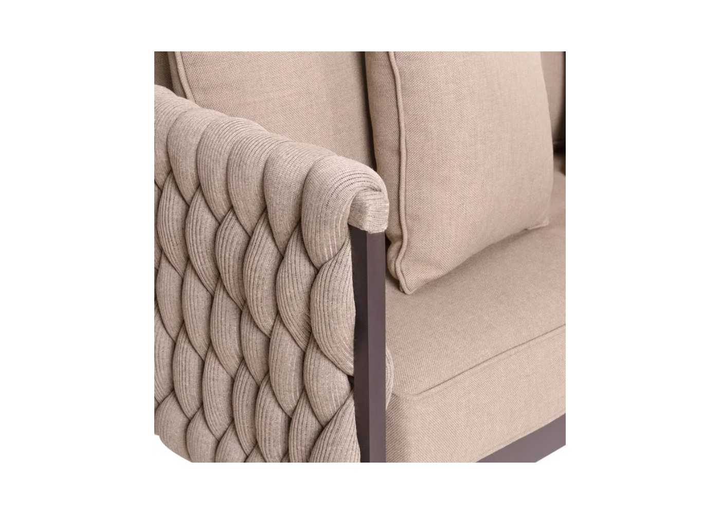 Tout l'extérieur du canapé est composé d'un tressage original en tissu *OLEFINE  de couleur taupe , avec un rembourrage en fibre synthétique DRALÓN broyée insérée dans des sacs en nylon étanches qui apportent une touche sophistiquée et élégante.
