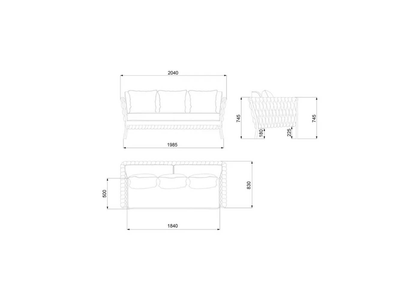 - Canapé 3 places : 206 cm de largeur x 83 cm de profondeur x 74 cm de hauteur.