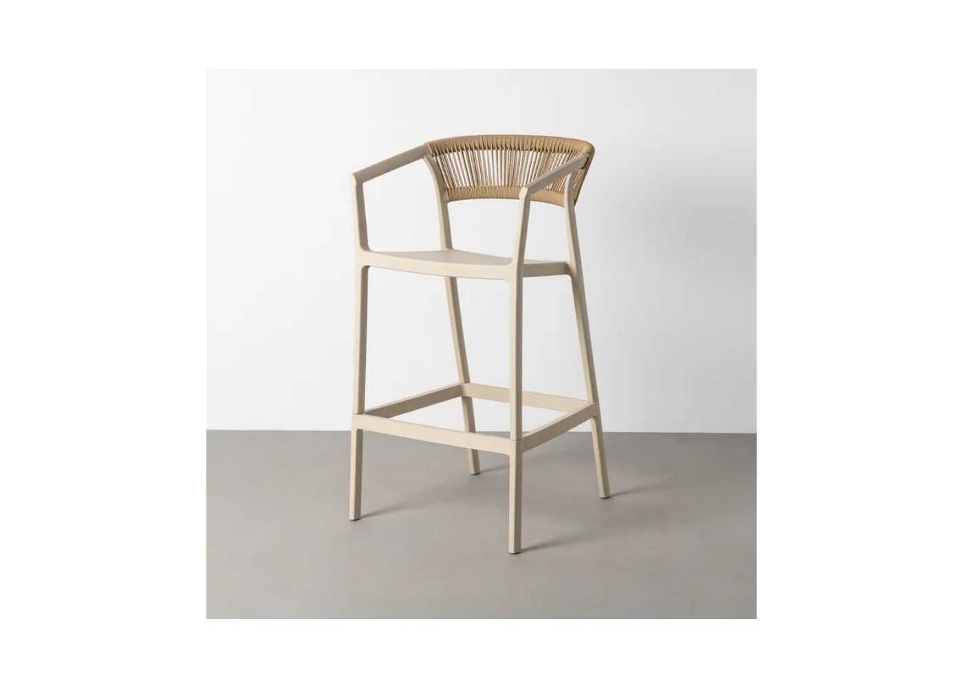 Élégant tabouret/chaise de jardin en polypropylène beige avec dossier original en cordage polyéthylène couleur naturelle.