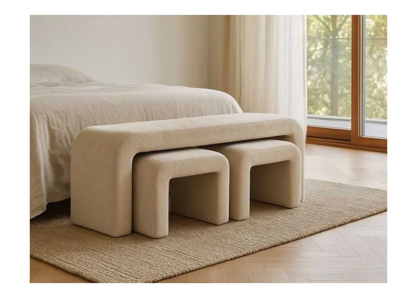 Ensemble élégant de banc tapissé aux lignes arrondies et de deux poufs tapissé rangés à l'intérieur.