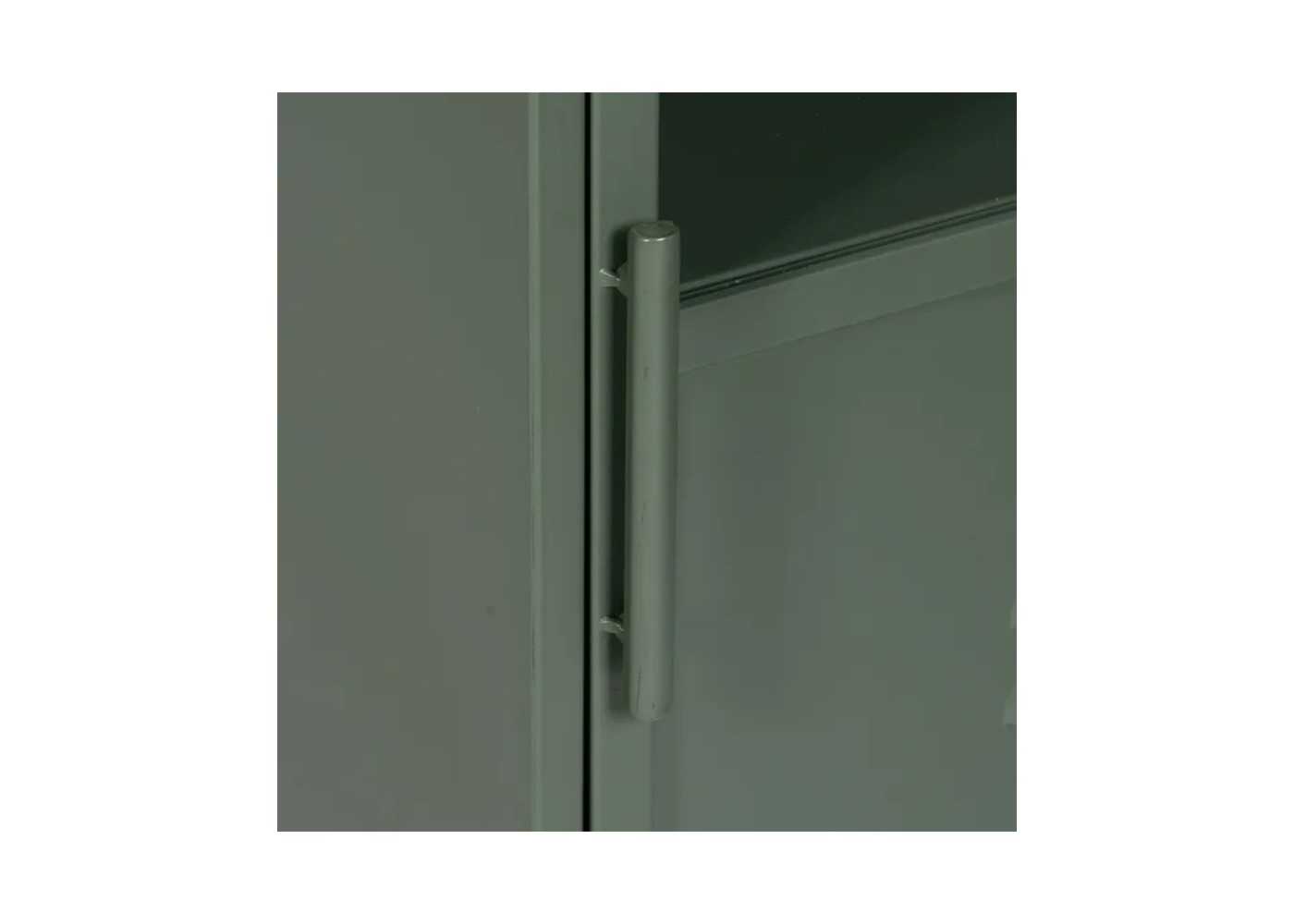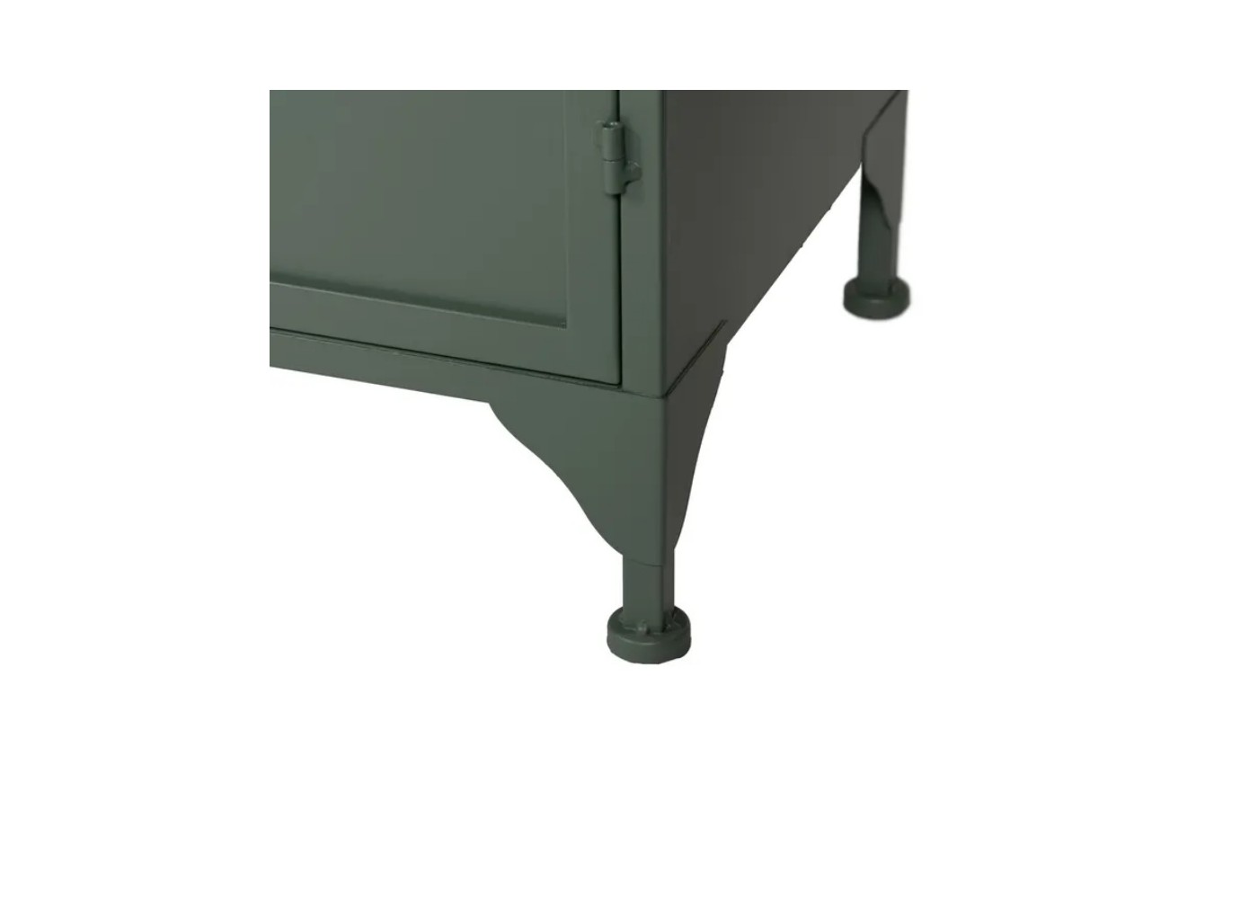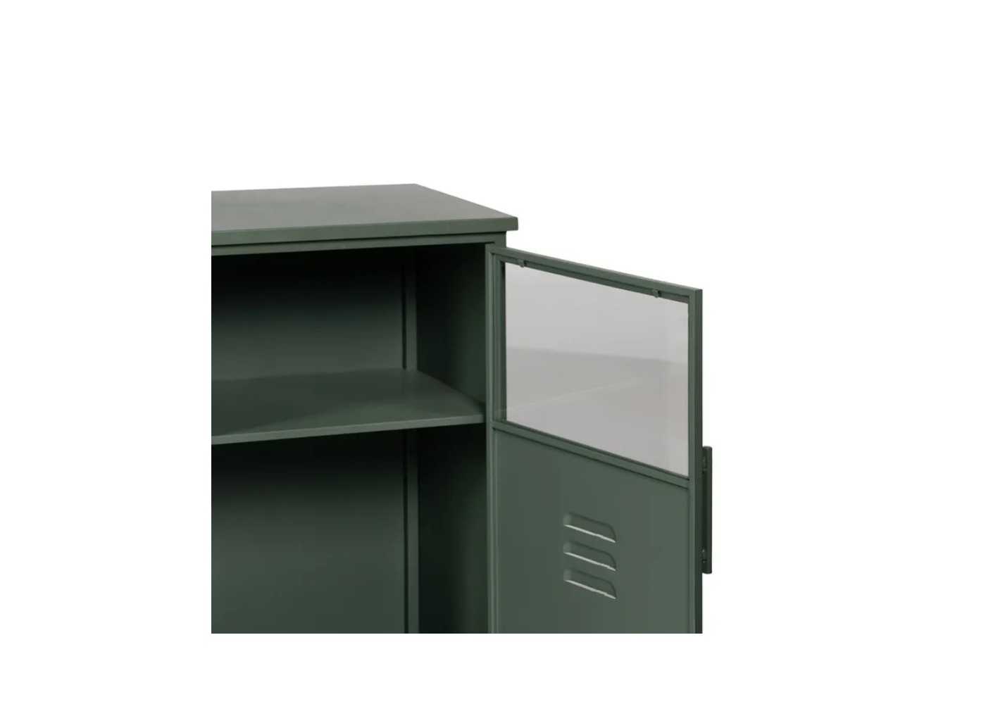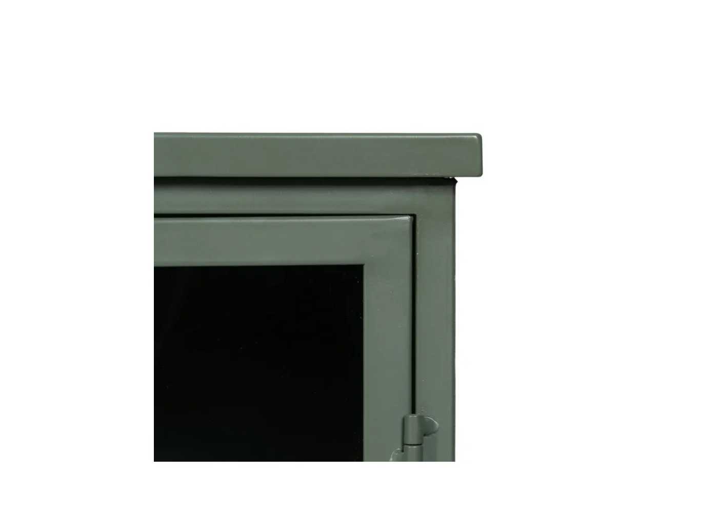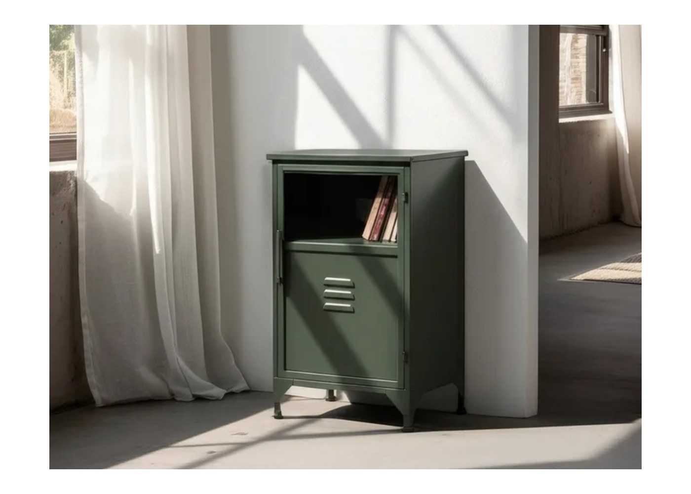 Module table de chevet ou classeur de bureau au design rétro et industriel avec porte et vitre, fabriqué en fer laqué vert menthe.