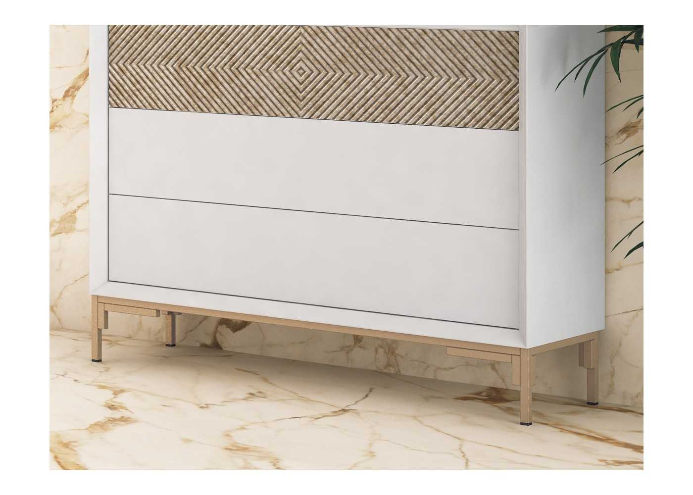 Façade du deuxième tiroir supérieur avec un motif original en losanges de couleur marbrée champagne. Possibilité de marbré argent sans supplément de prix.