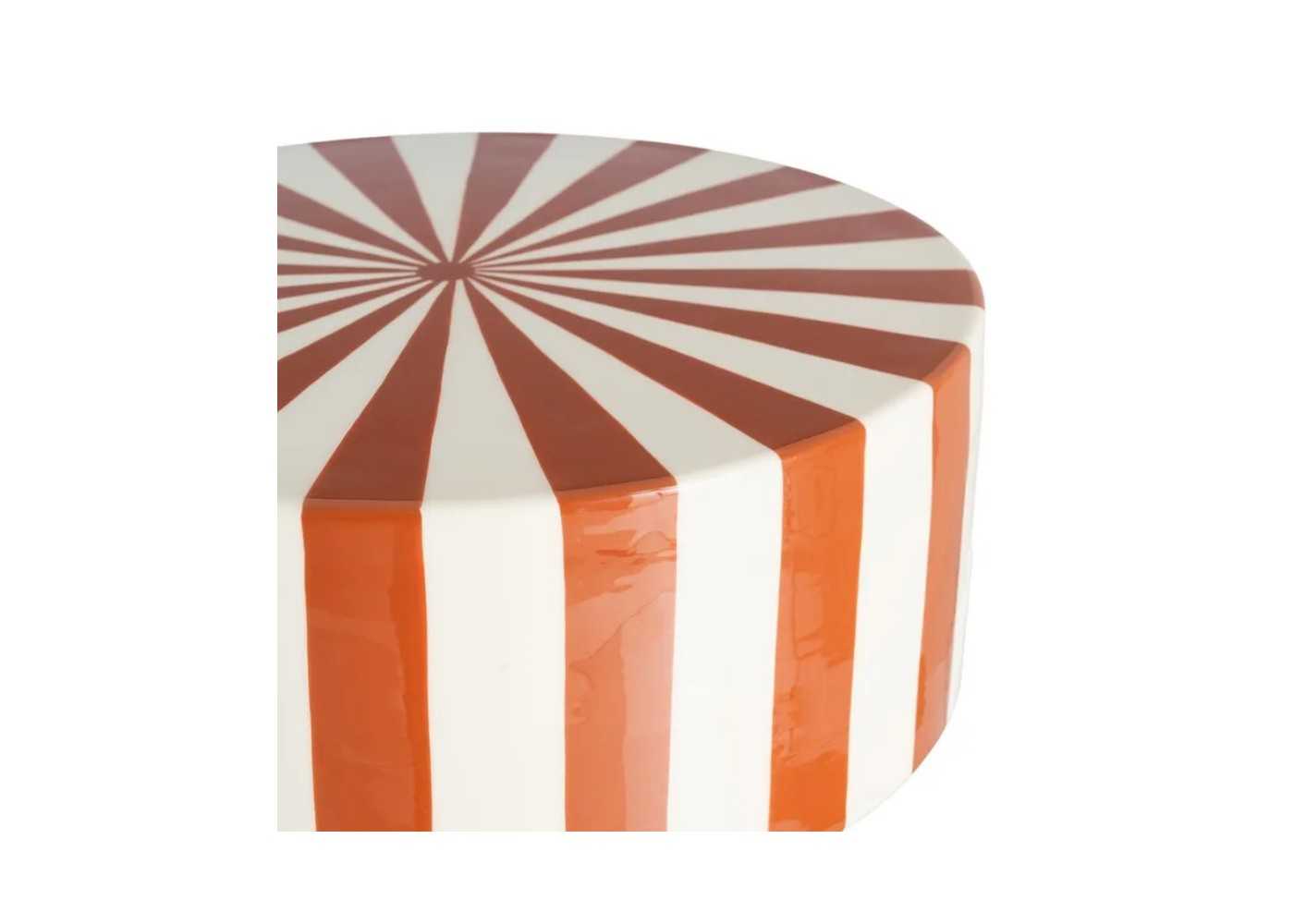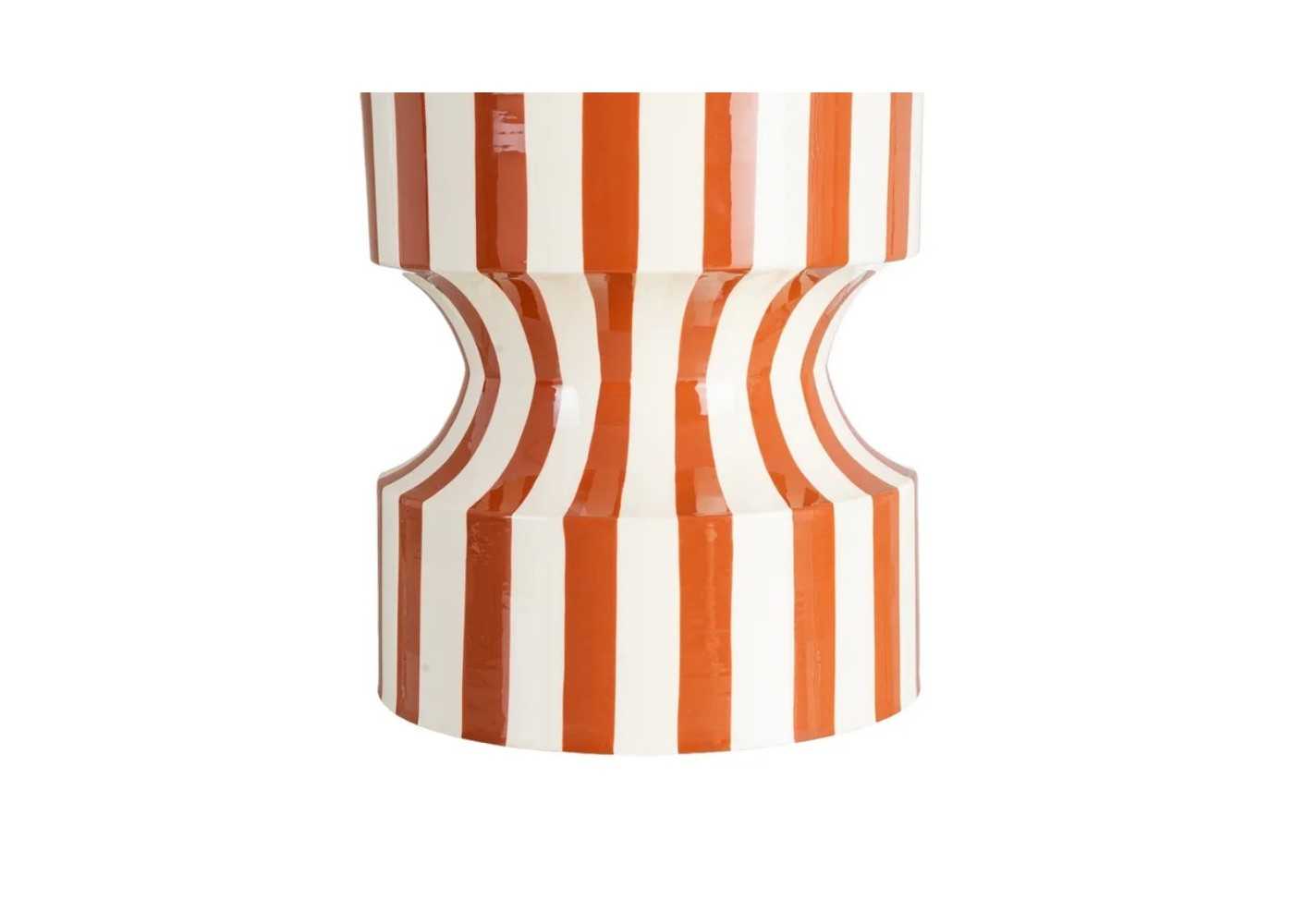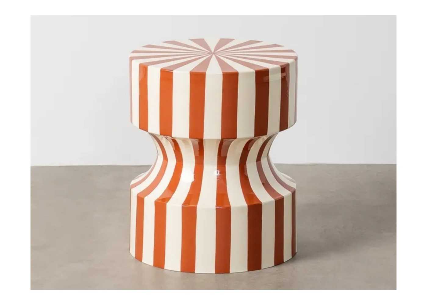 Table d'appoint au design original, laquée à rayures blanches et terracotta.