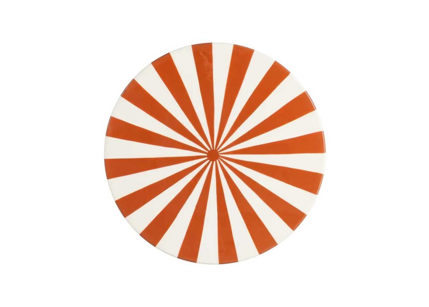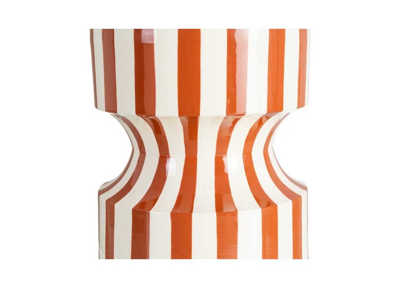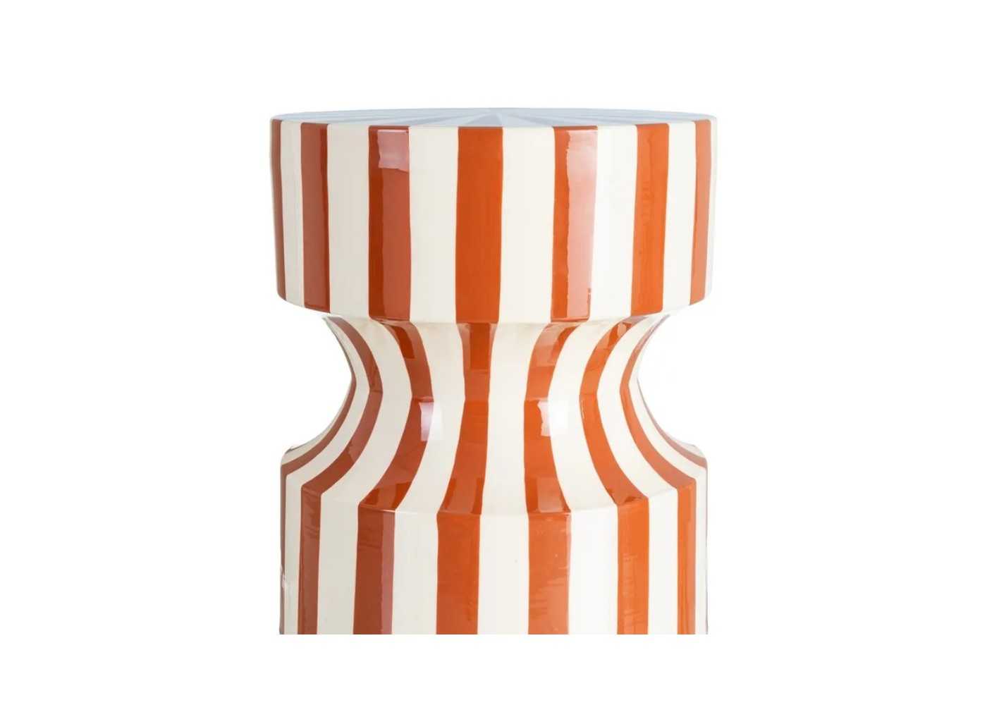 Table d'appoint au design original, laquée à rayures blanches et terracotta.