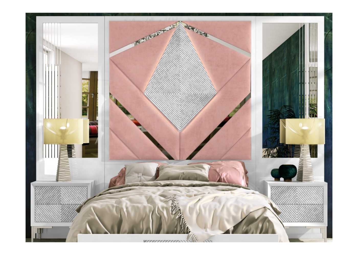 Plafonnier central au design géométrique original, recouvert de velours PAPILLON rose panthére avec des détails originaux en plaques de méthacrylate effet miroir de 5 mm d'épaisseur et 25 mm de largeur. Plafonnier central au design original en losanges de couleur marbrée argent. Possibilité de marbré champagne sans supplément de prix.