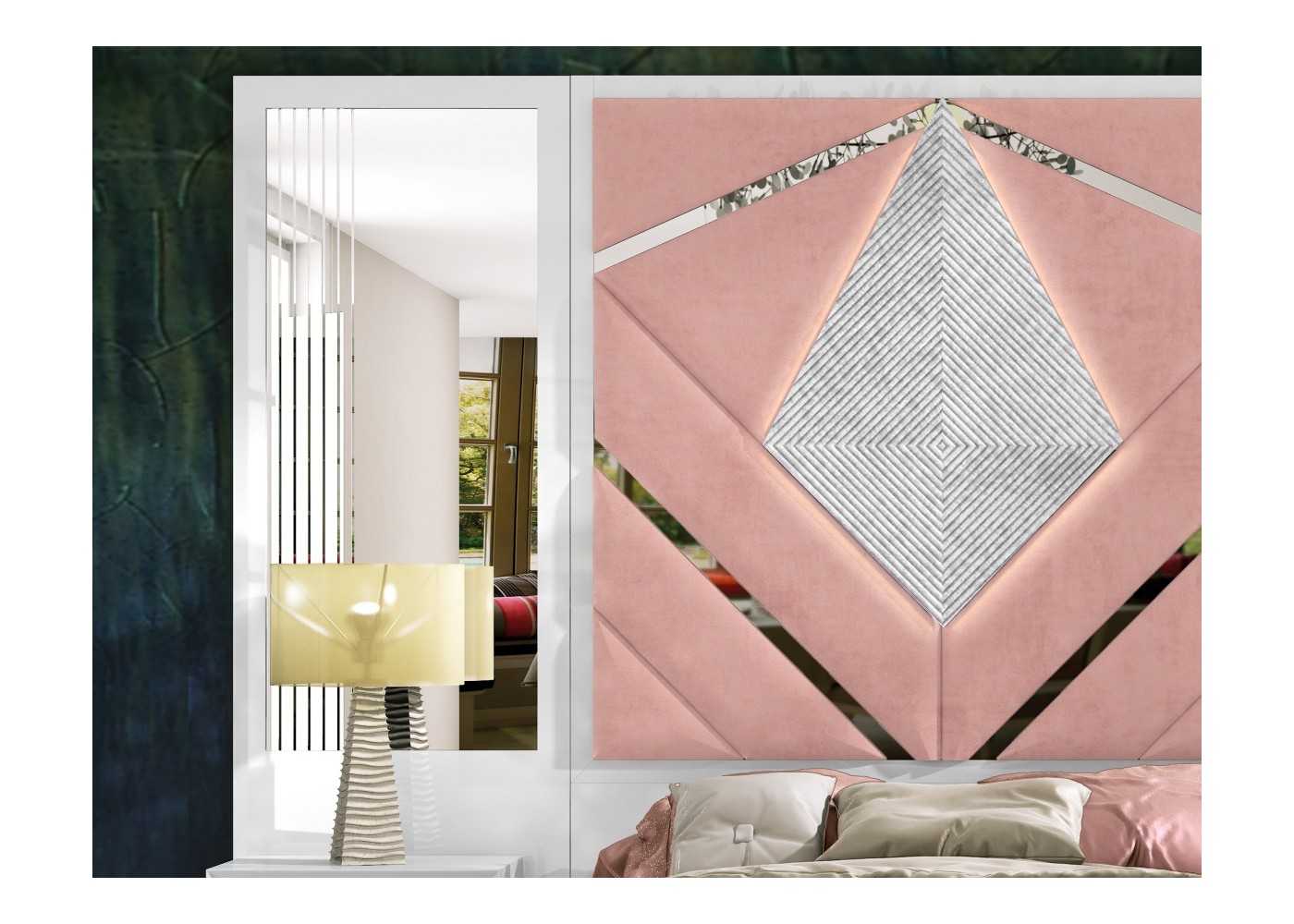 Sommier avec plinthe de 8 cm laquée assortie en blanc pur mat avec détail central en losanges couleur marbré argent. Possibilité de marbré champagne sans supplément de prix. Éclairage LED avec capteur intégré dans la plinthe du sommier.