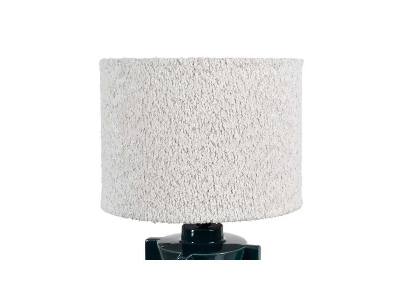 Lampe de table élégante avec une base en céramique et un abat-jour en tissu bouclé blanc.